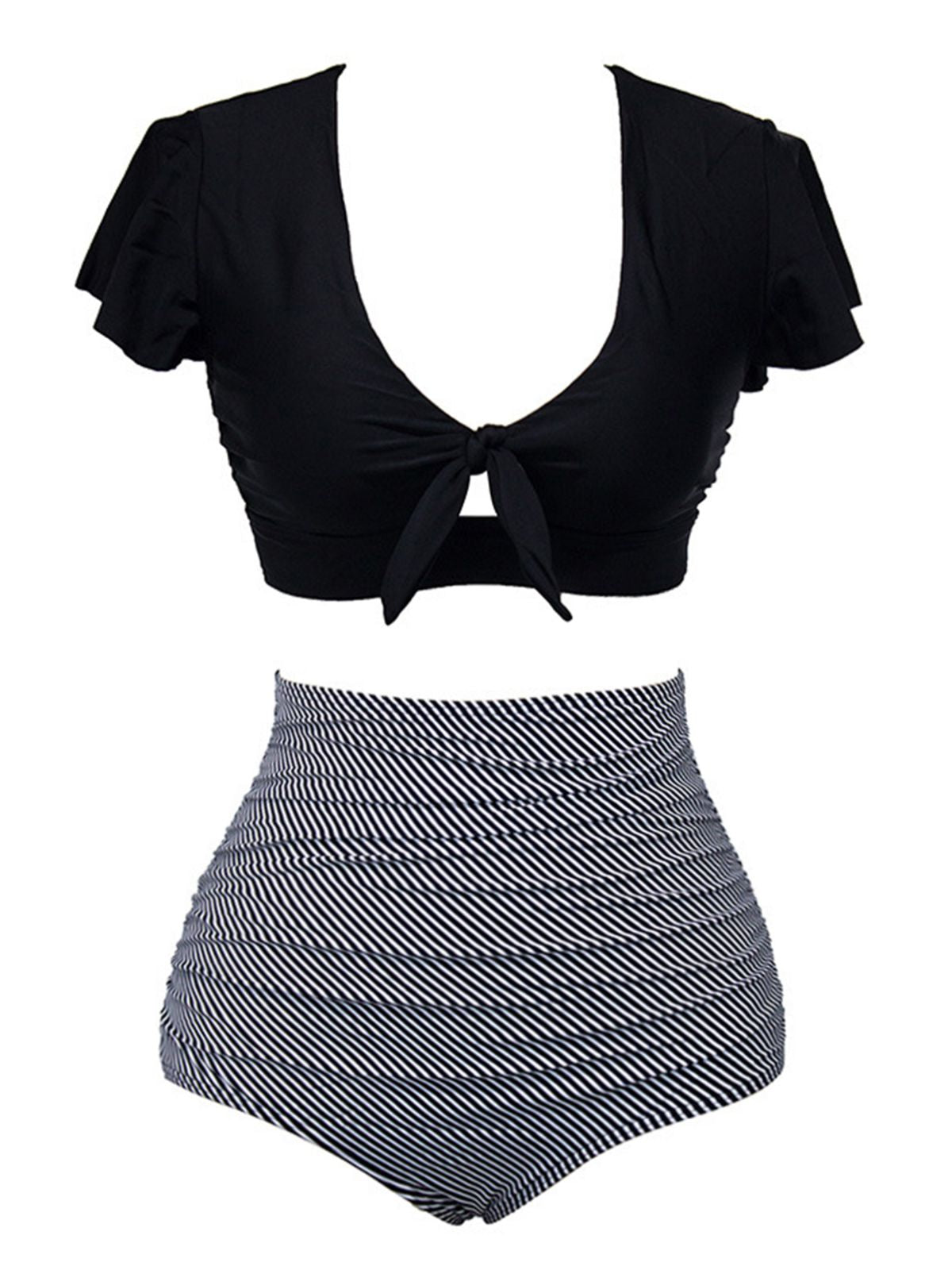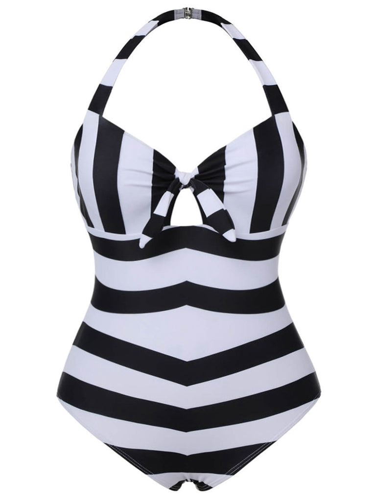 [Plus Size] Black & White 1950s Barbie Striped Halter One-Piece Swimsuit