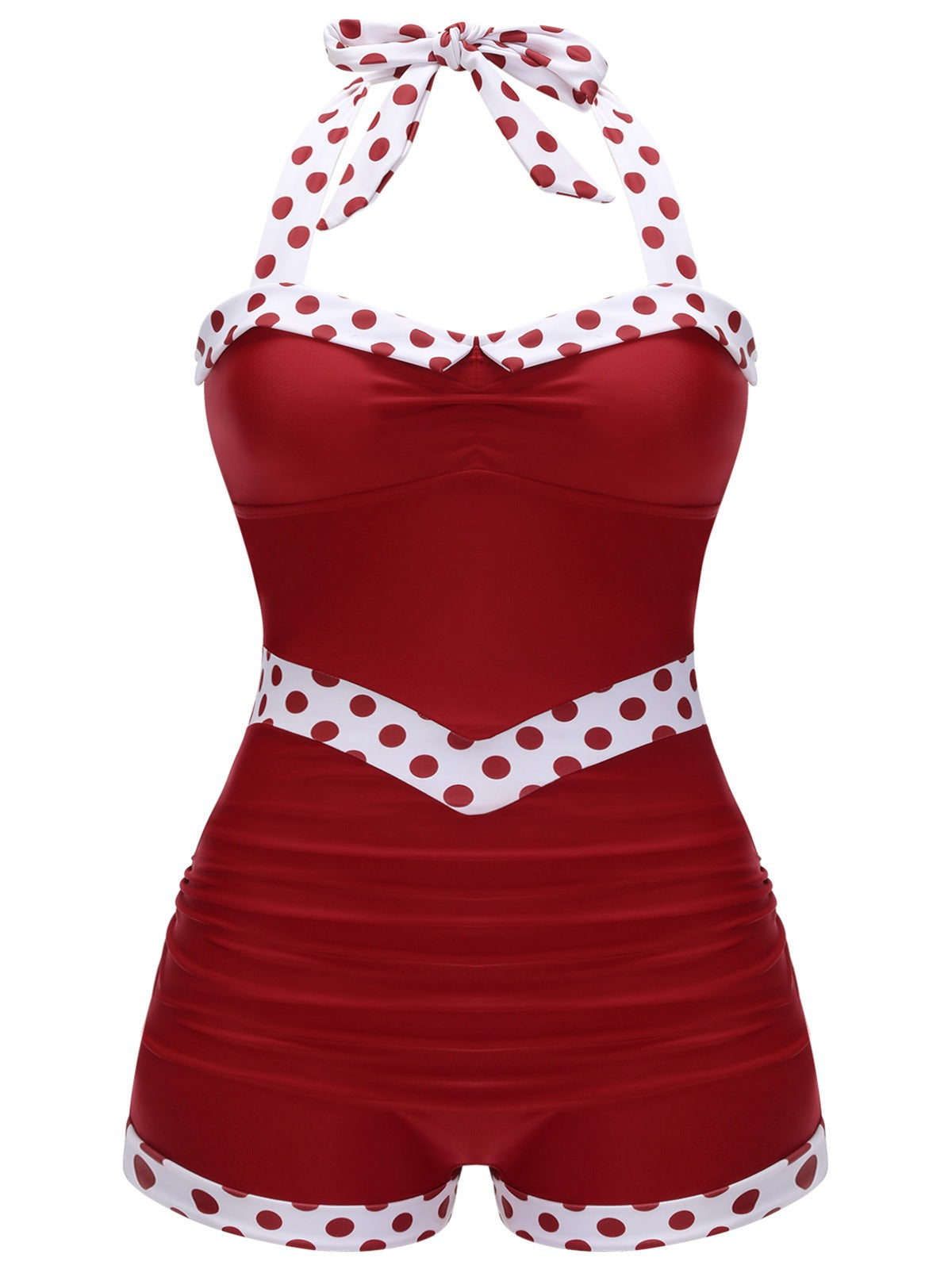 [Plus Size] Red 1940s Dots Patchwork Halter Swimsuit