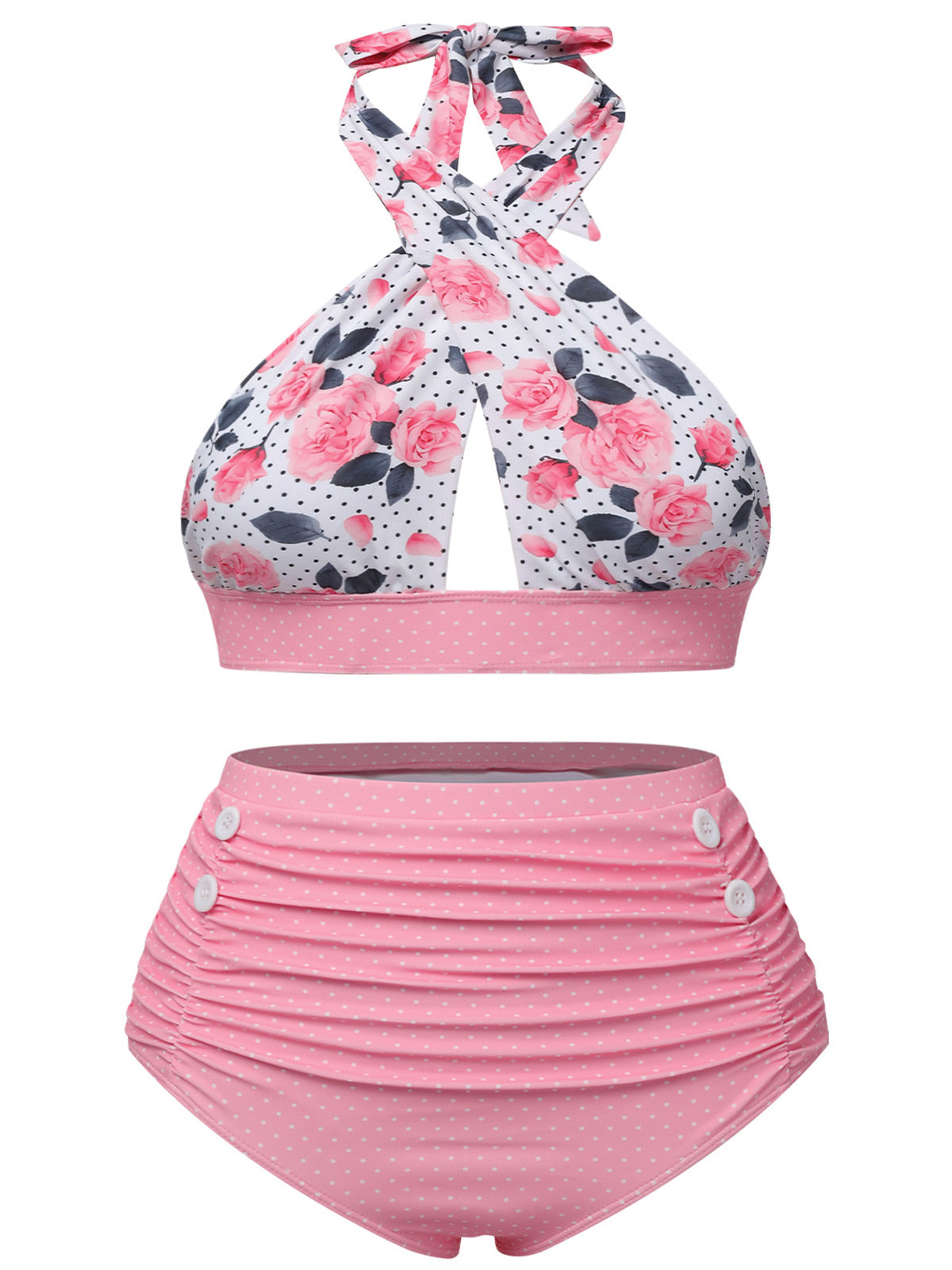 [Plus Size] Pink 1940s Floral Cross Halter Swimsuit