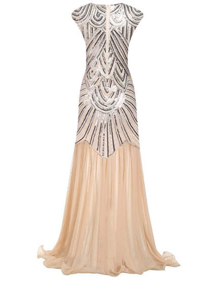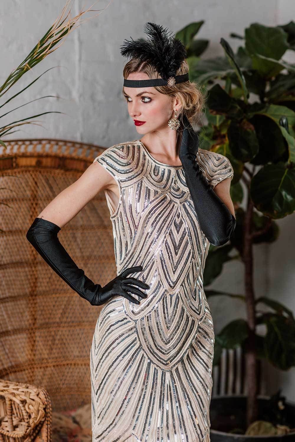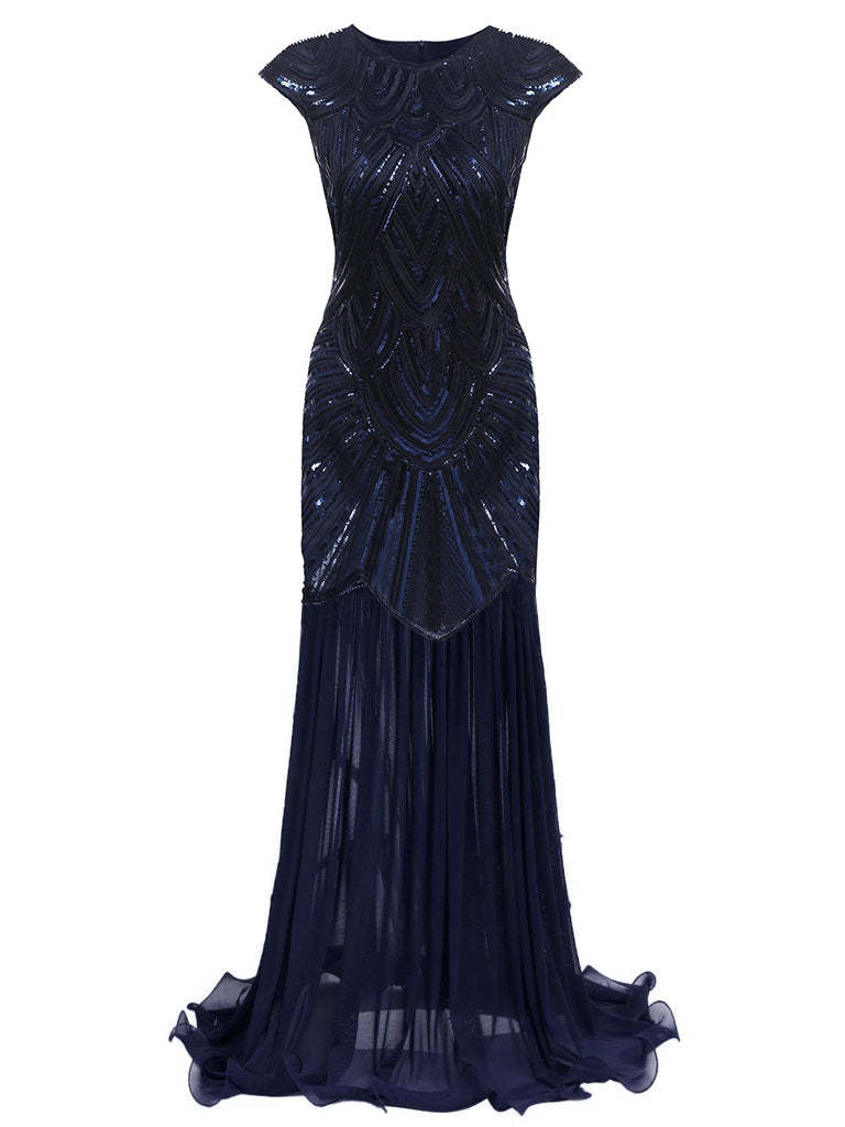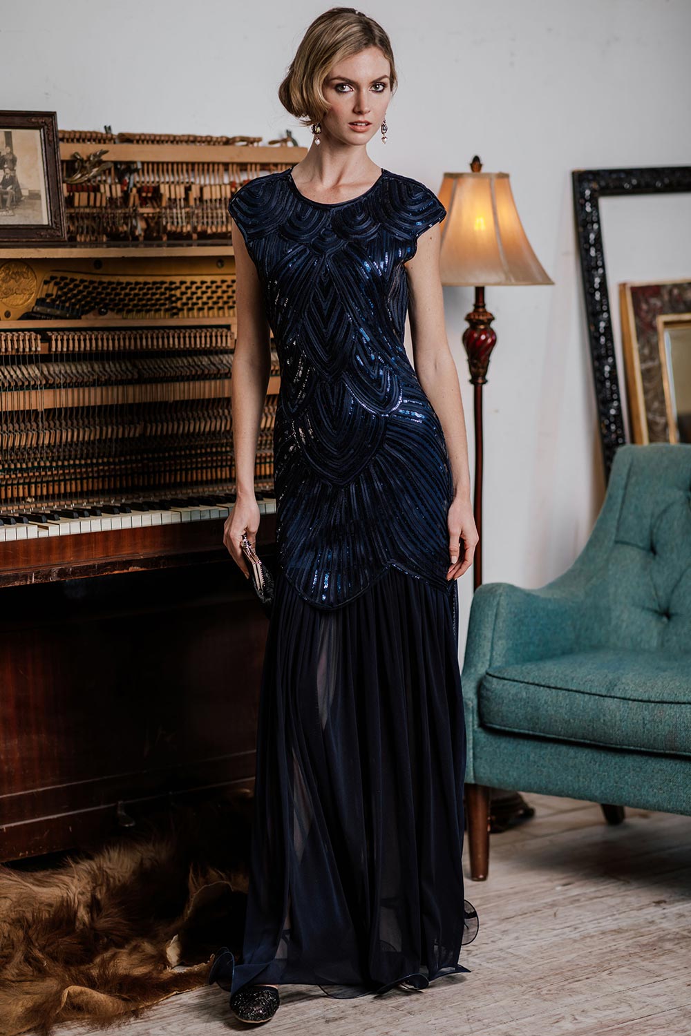 Sparkling, stylish, and spectacular! This classy cocktail dress exudes the majesty of the 1920s with a chic navy blue and pink mesh over knit lining, embellished with twinkling black and silver sequins and beading. This Flapper Dress from Retro Stage is cast in an unstoppable 1920s-style cocktail dress that demands attention.