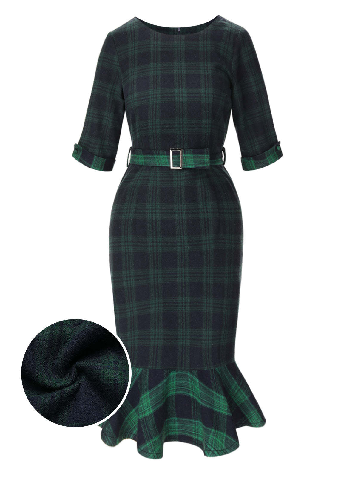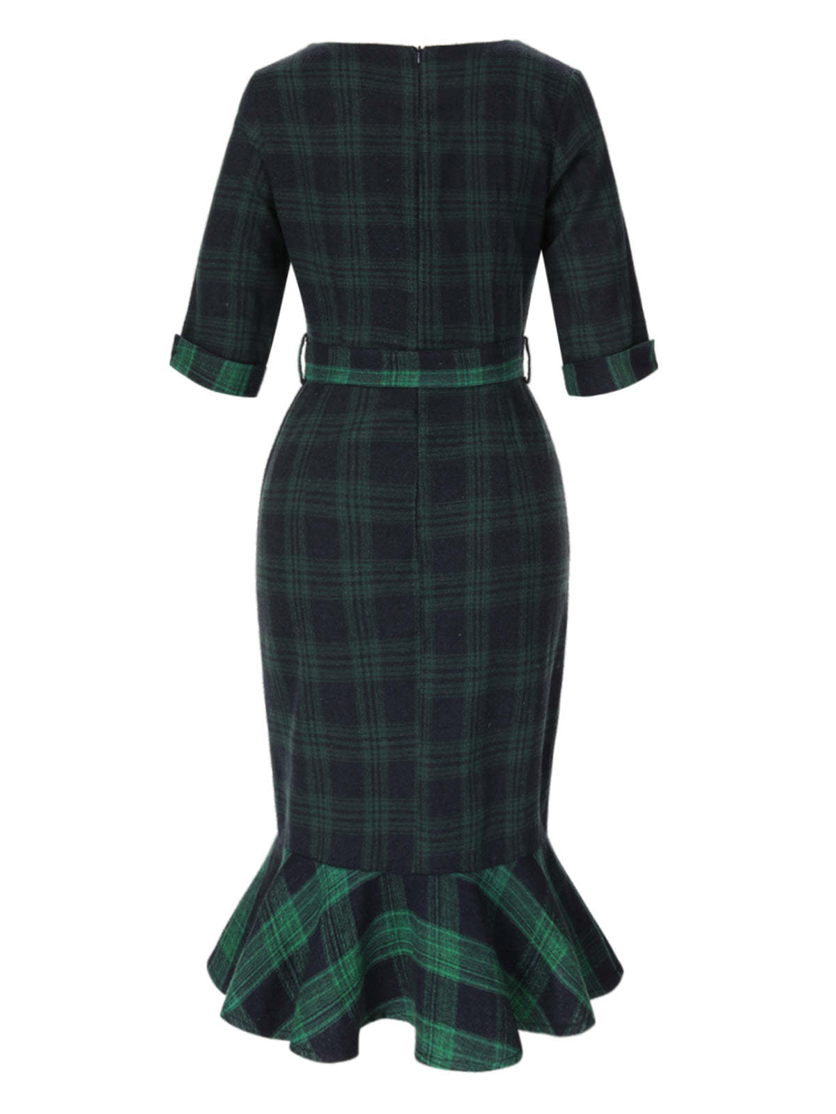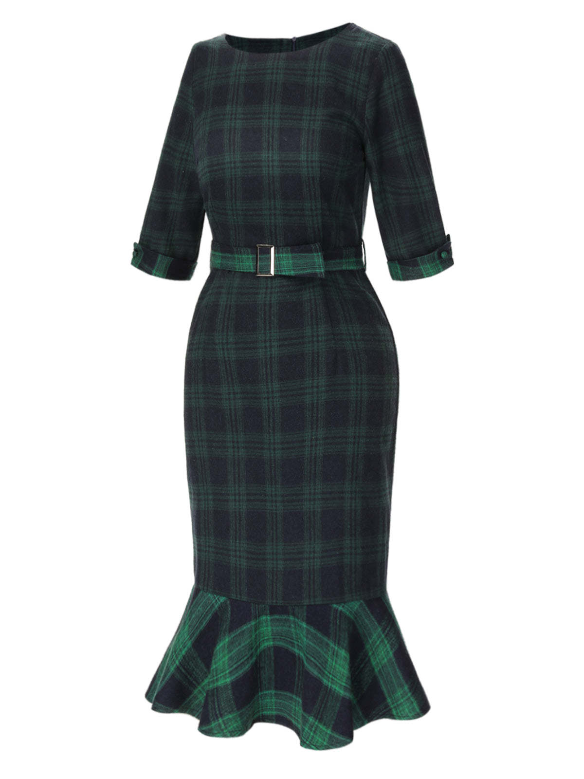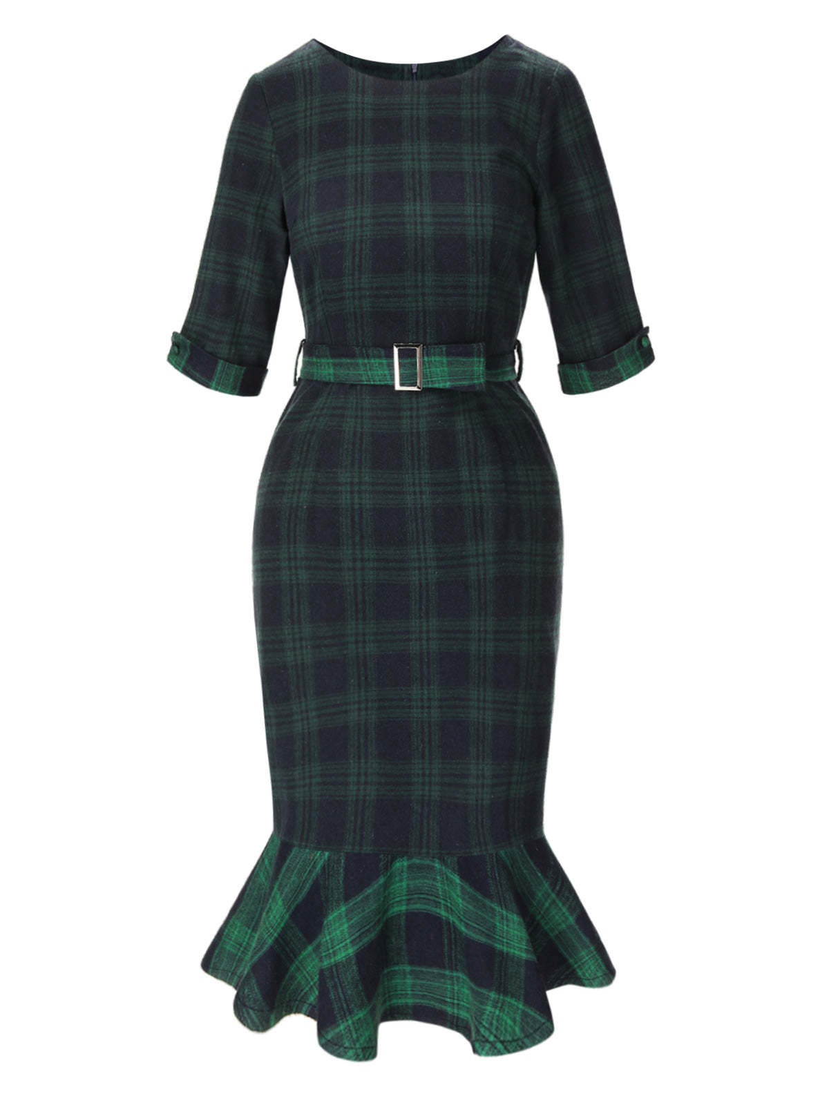 1930s Crew Neck Tartan Plaid Belted Mermaid Dress
