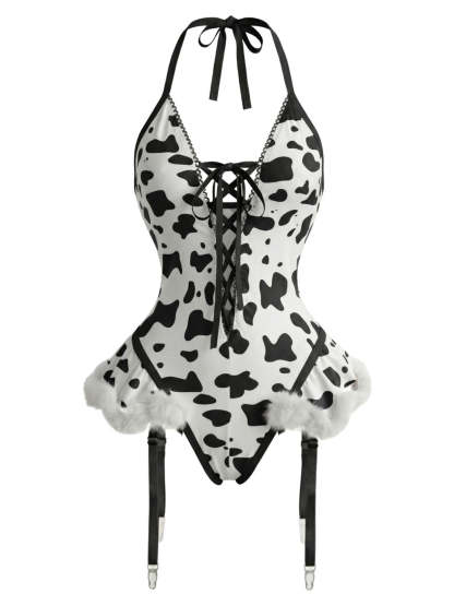 1960s Cow-Spotted Halter Lace-Up Plush Lingerie Set