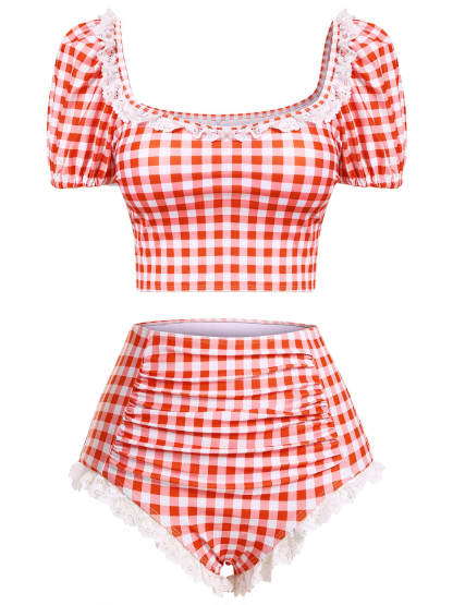 2PCS 1960s Plaid Lace Patchwork Swimsuit
