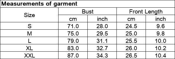 Size: There are 5 sizes (S/M/L/XL/XXL) available. Please allow 1 inch differs due to manual measurement. Thanks for understanding! (All measurement in cm and please note 1 inch=2.54cm)