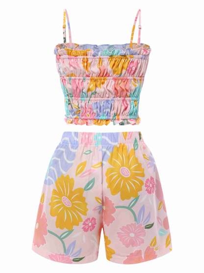 2PCS Pink 1960s Floral Print Ruffles Spaghetti Straps Camisole & Shorts