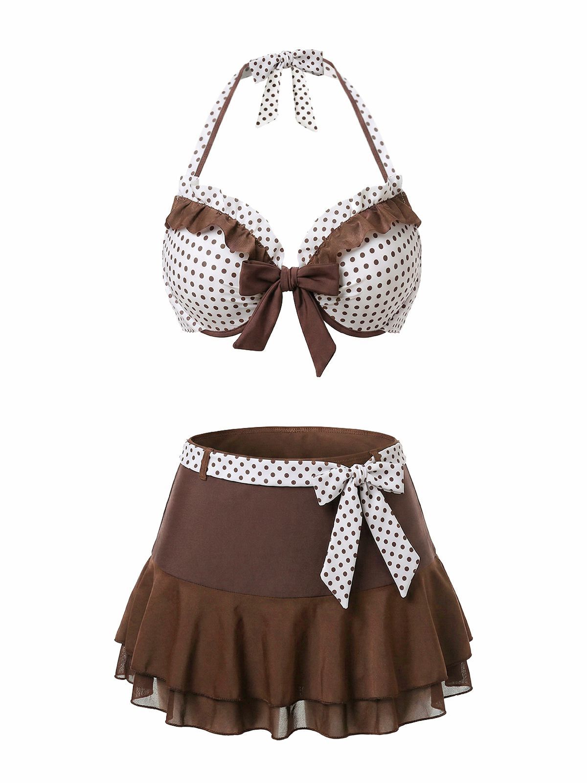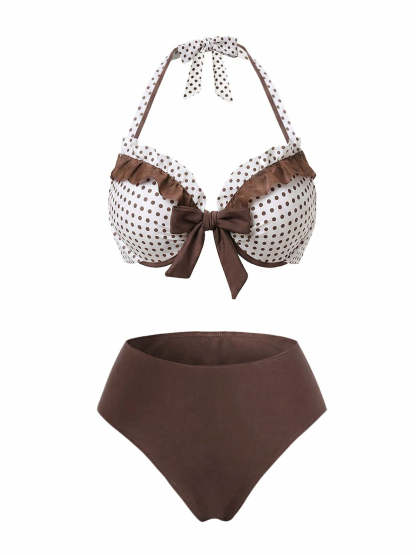 3PCS Brown 1970s Polka Dot Ruffle Halter Swimsuit Set