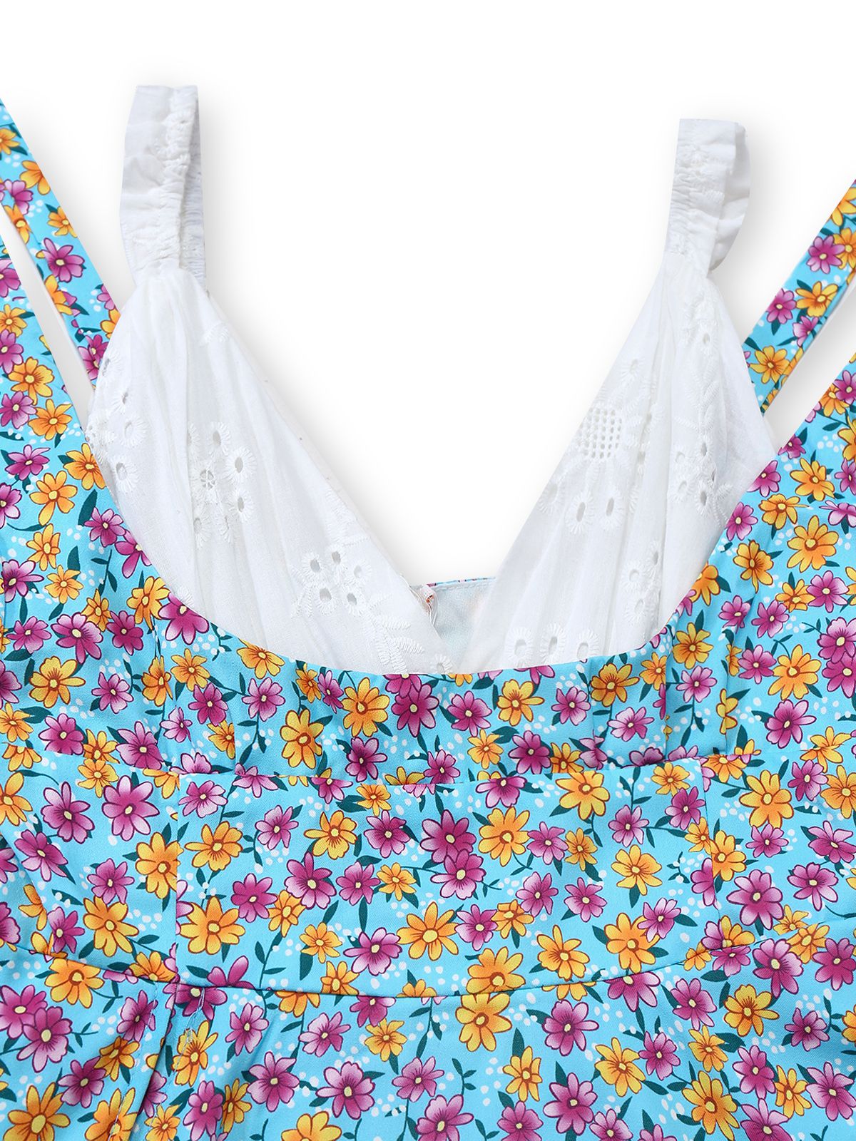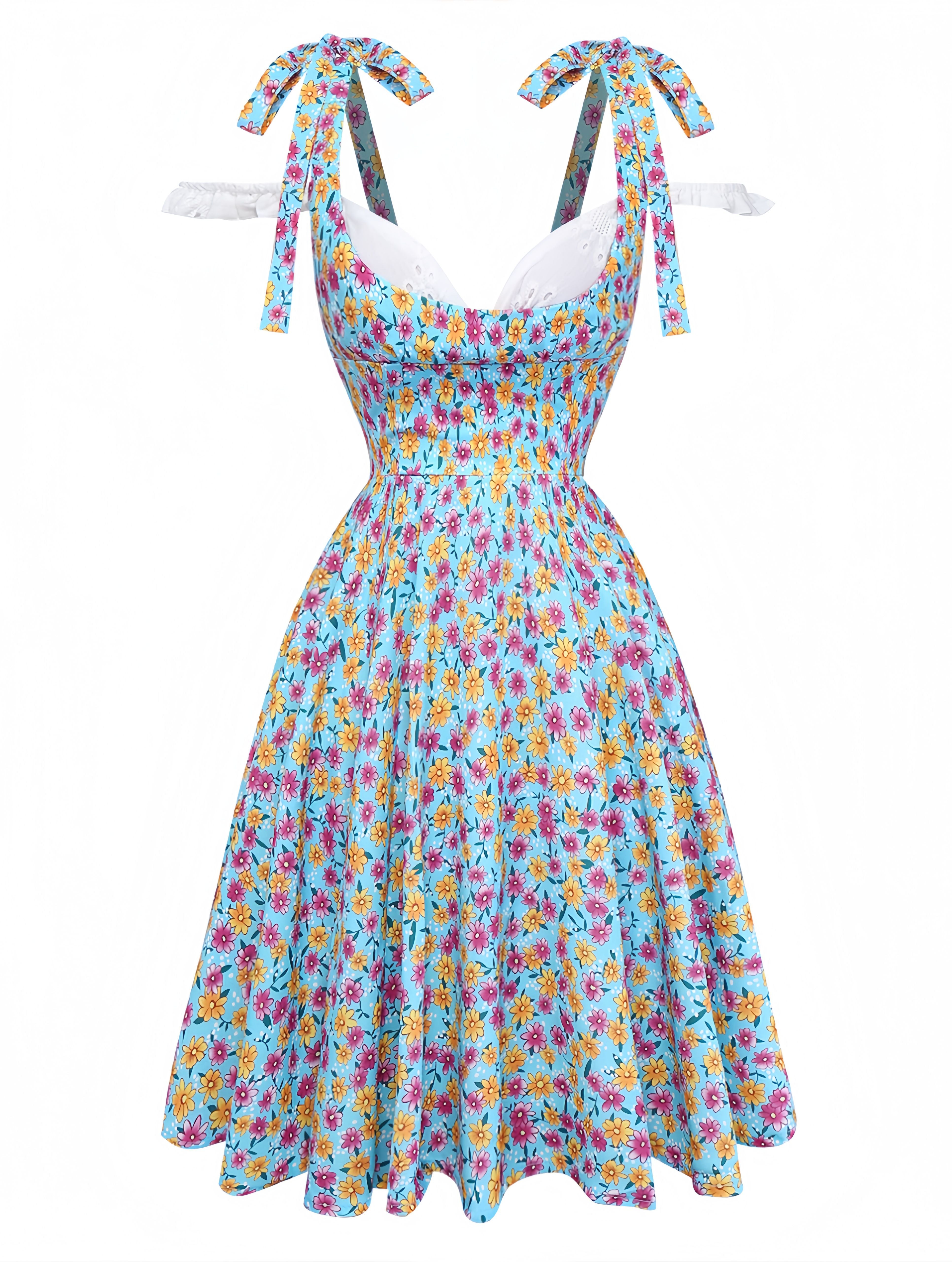 Blue 1960s Daisy Floral V-Neck Slit Short Dress