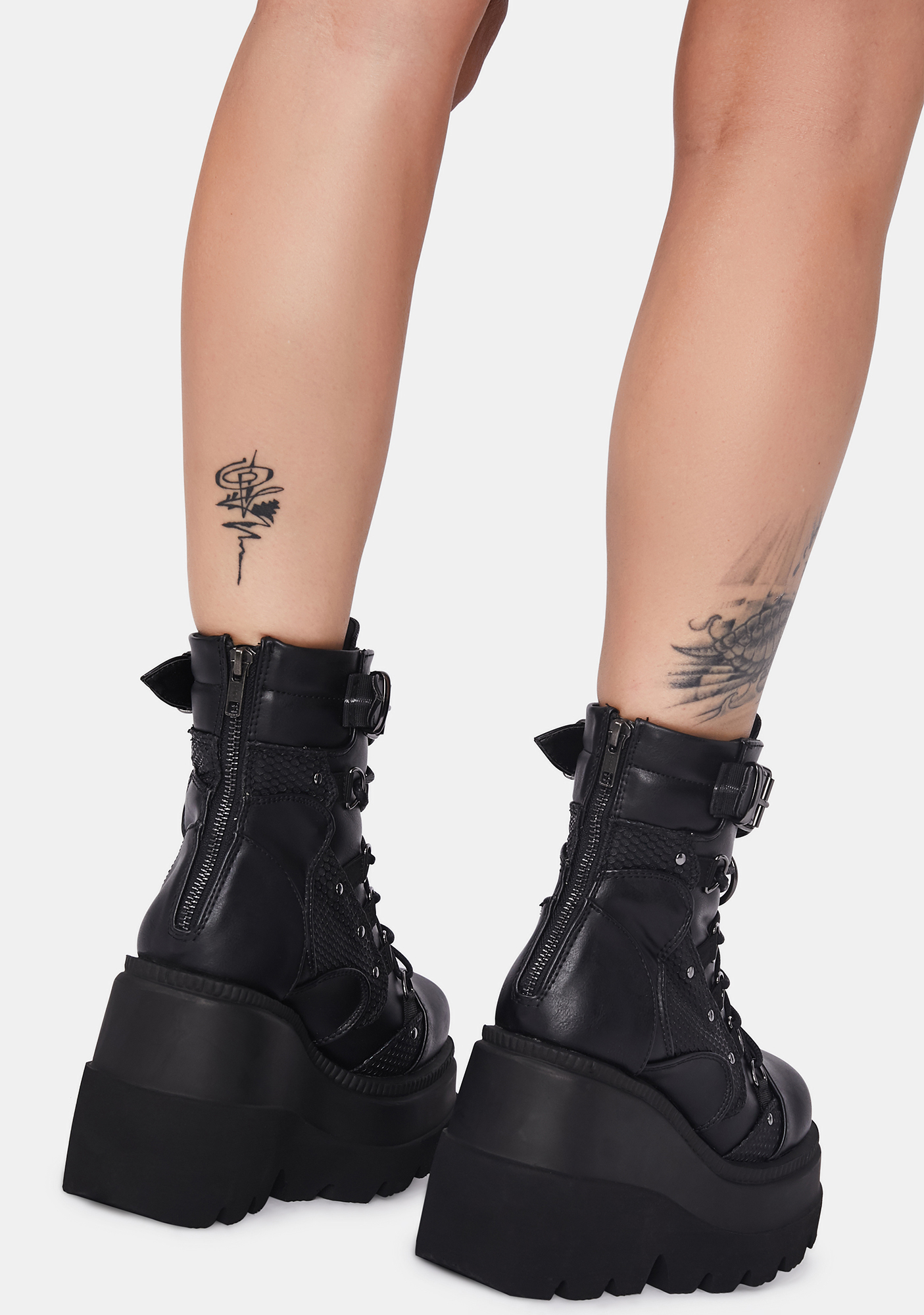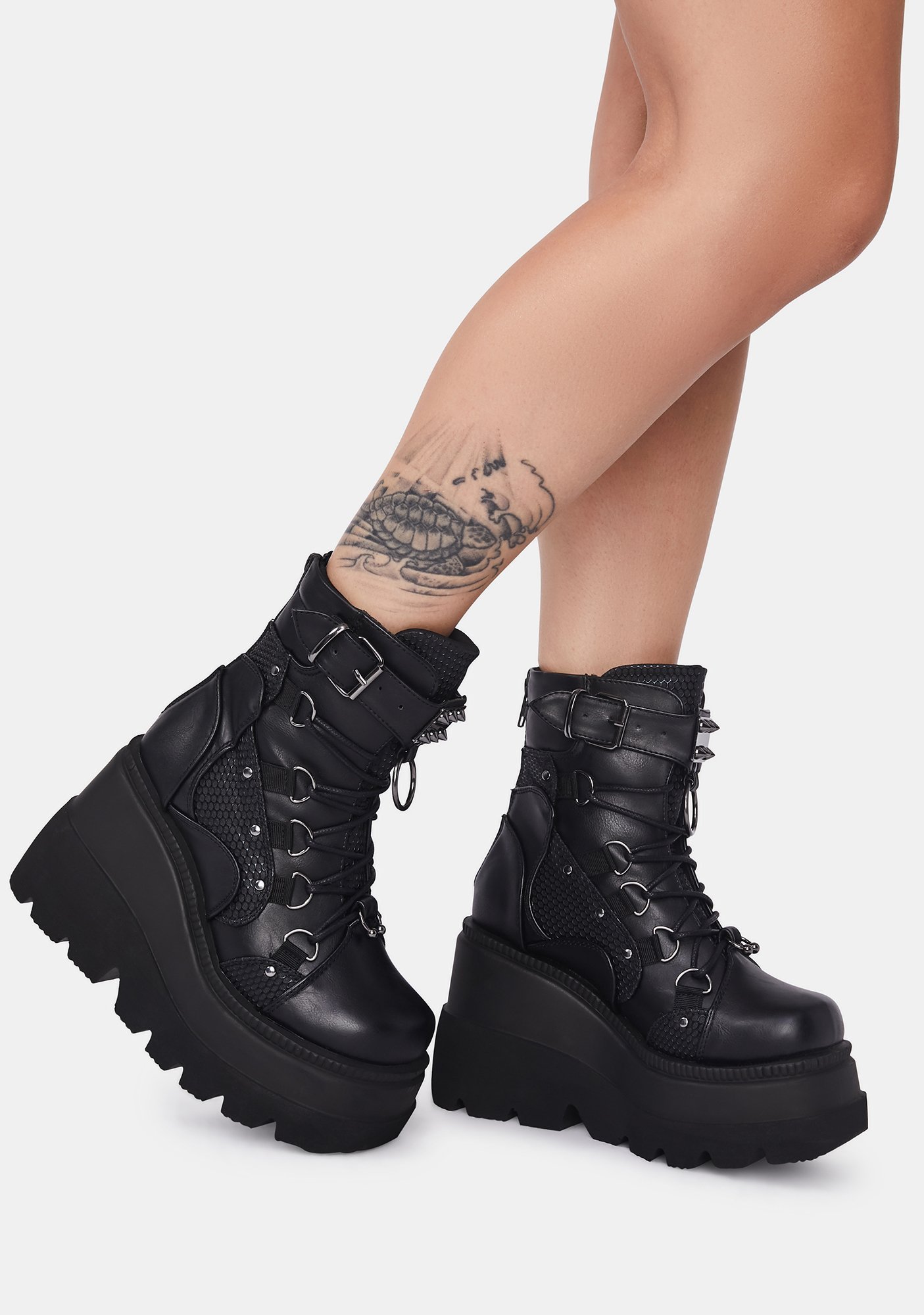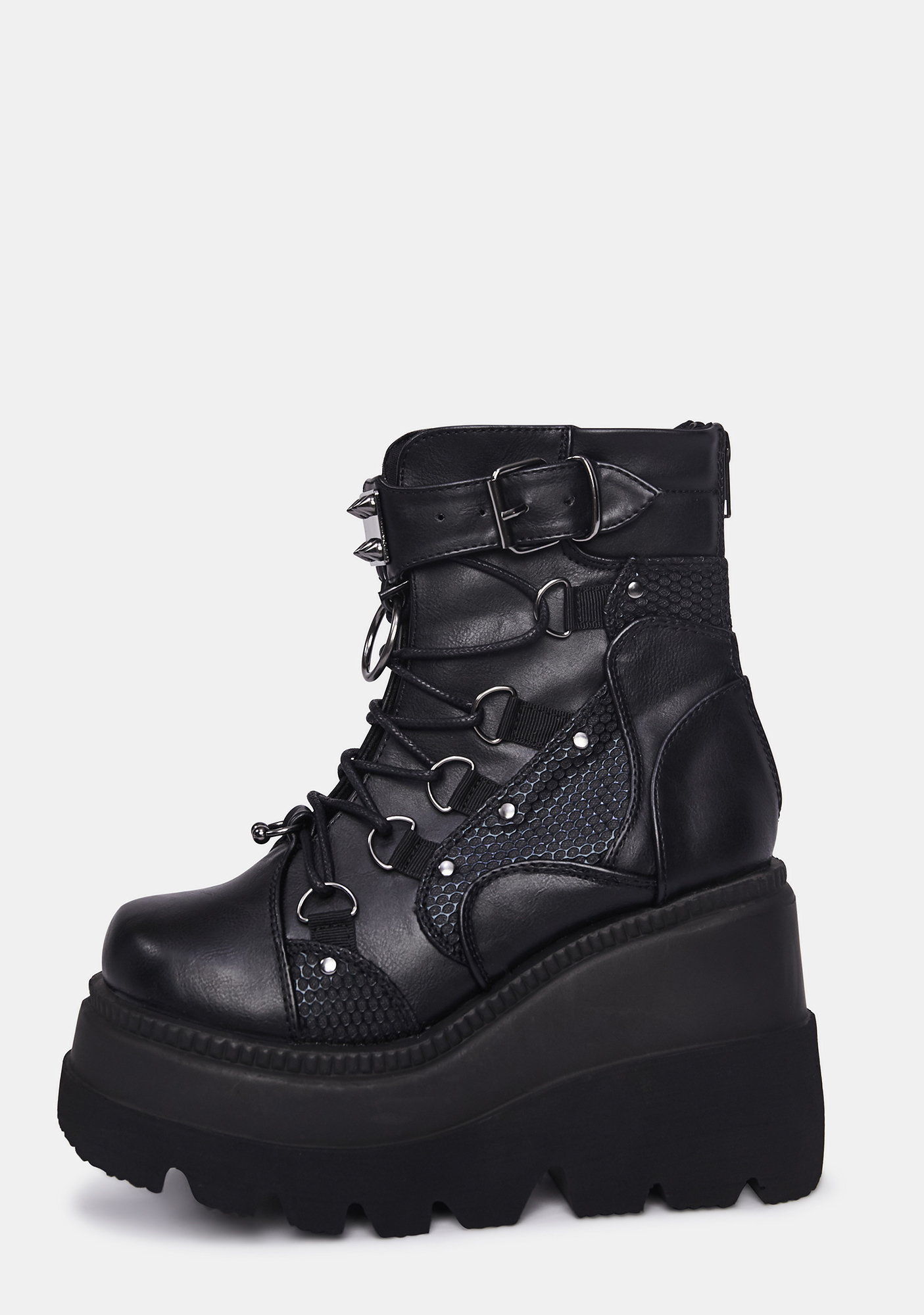 Combat Technopagan Platform Boots cuz your dark arts require some deep house beatz. These platform boots have a vegan leather construction with fishnet texture details, spiked straps with O-ring hardware, lace up fronts, and side zipper closure.