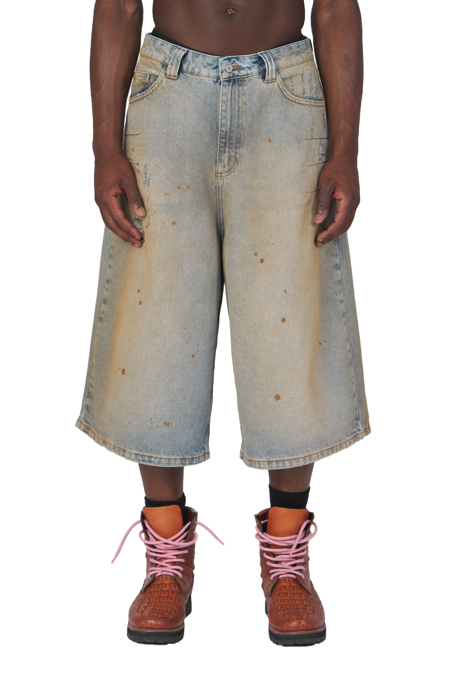 - Male Model is 186 cm wears LARGE- 100% Cotton- Fits Baggy- Sand Washed- Handmade Distressings and Paint Splatters- uniquely washed