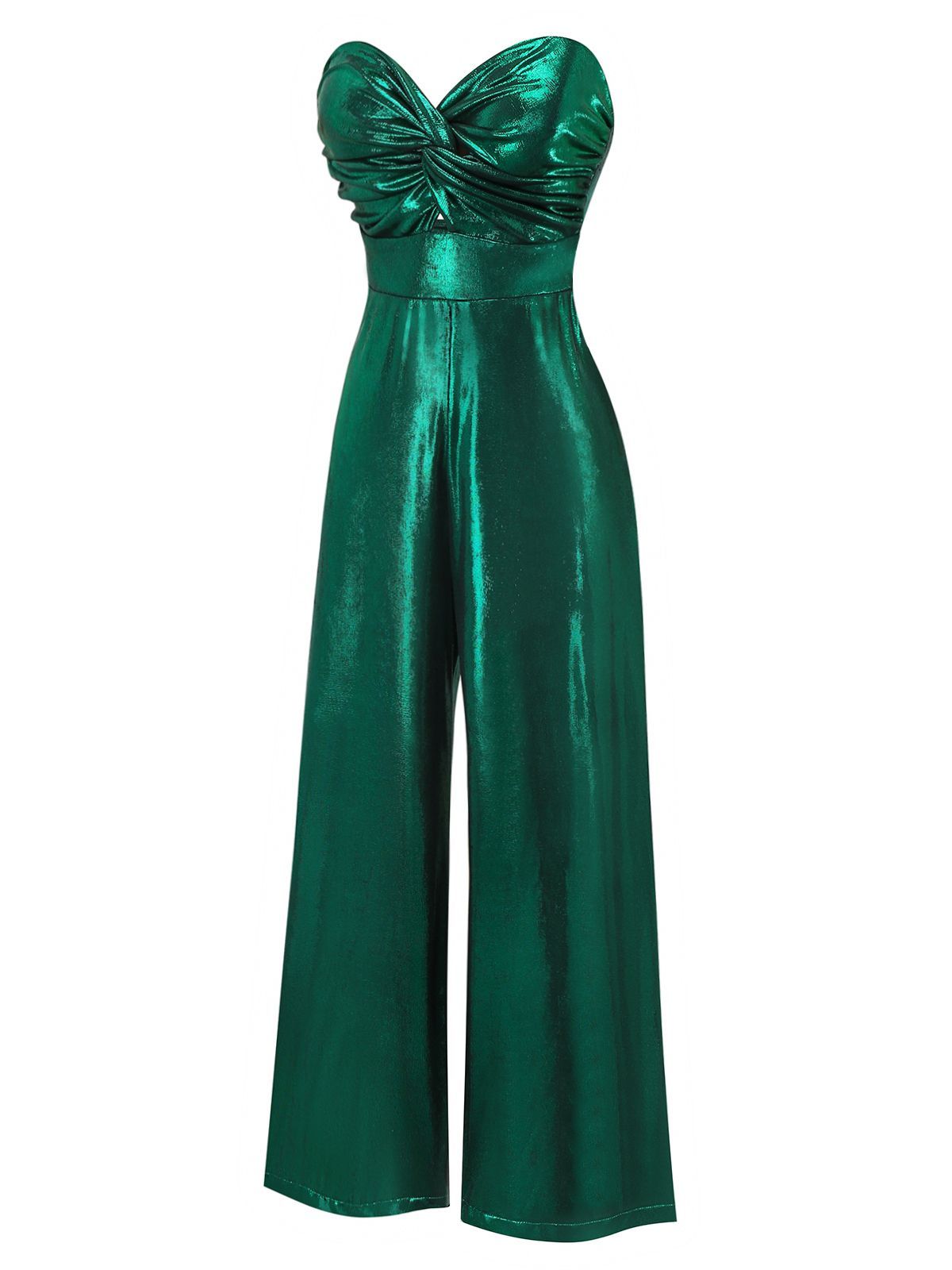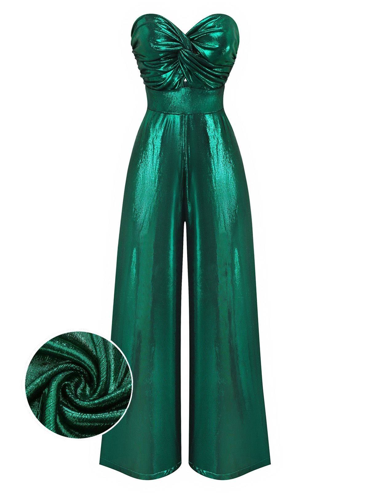 Disco lights bounce off this Retro Stage 1970s jumpsuit, perfect for vintage lovers who crave full-on glam. Shiny emerald fabric wraps into a ruched strapless bodice and nipped-in waist before flowing into dramatic wide legs. Slip into this 1970s disco jumpsuit with heels and you’ll shimmer like the star of the dance floor.