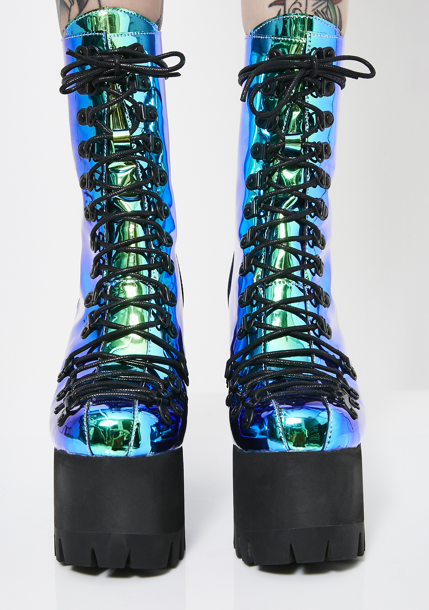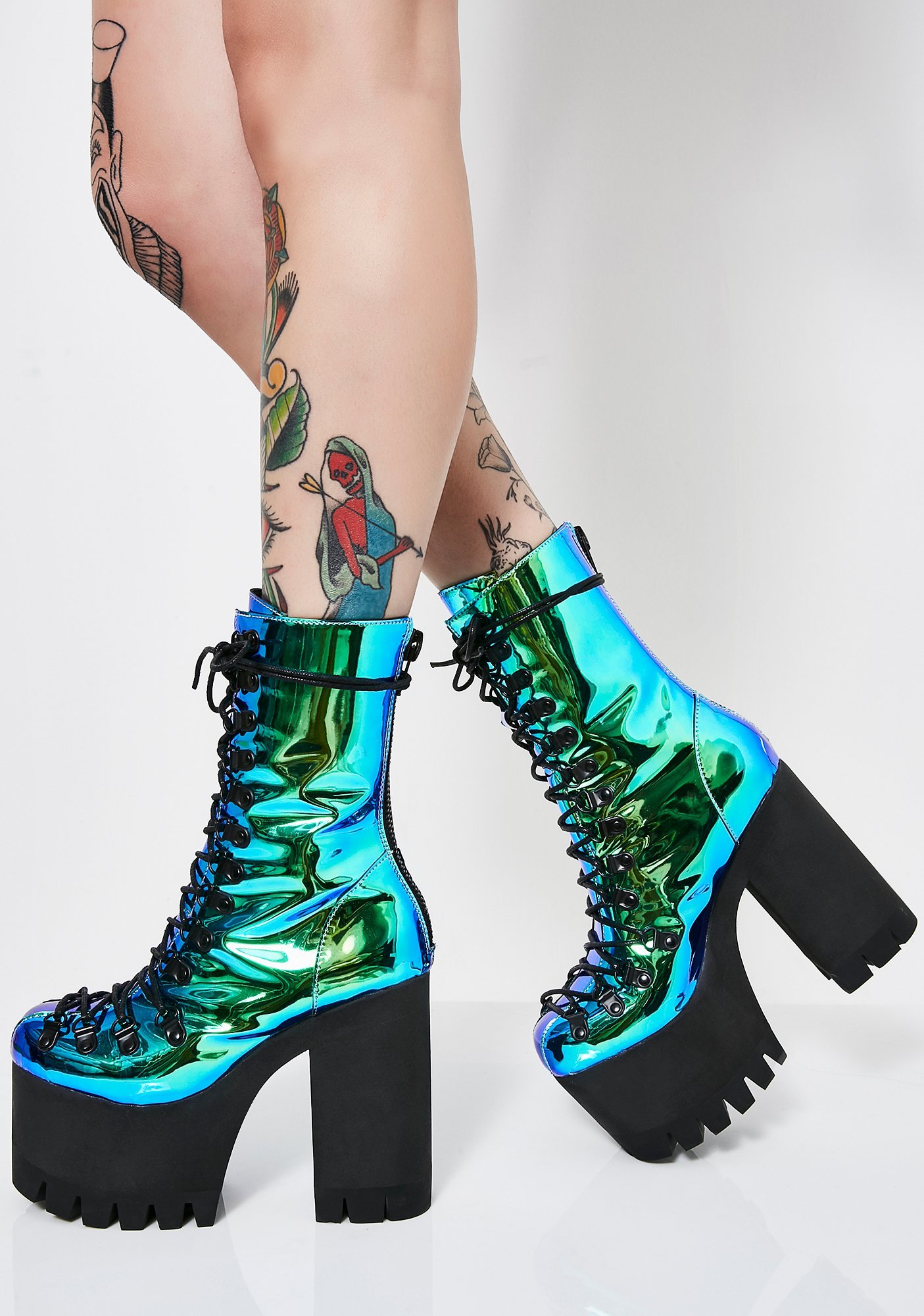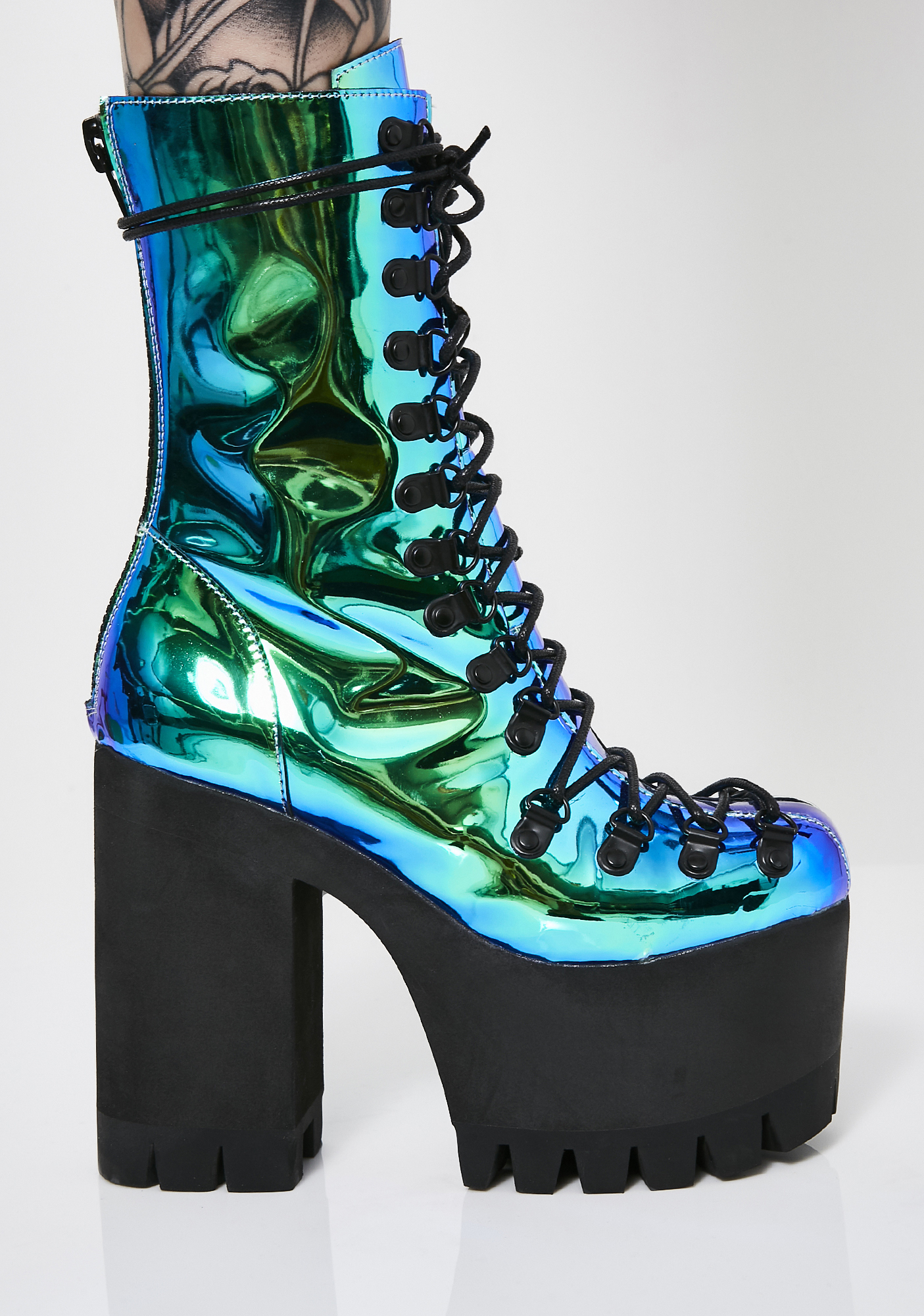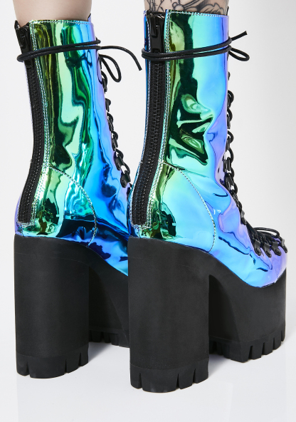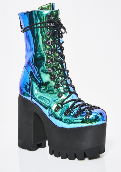 Moonstone Platform Boots cuz you’re an exxtra dimensional Goddess!! Beam ‘em with your bae vibez in these magical AF boots that have a sikk N’ shiny mermaid material and a back zipper closure.