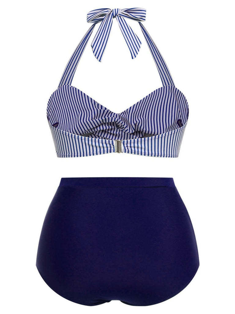 [Plus Size] Blue 1940s Striped Halter Bowknot Bikini Set