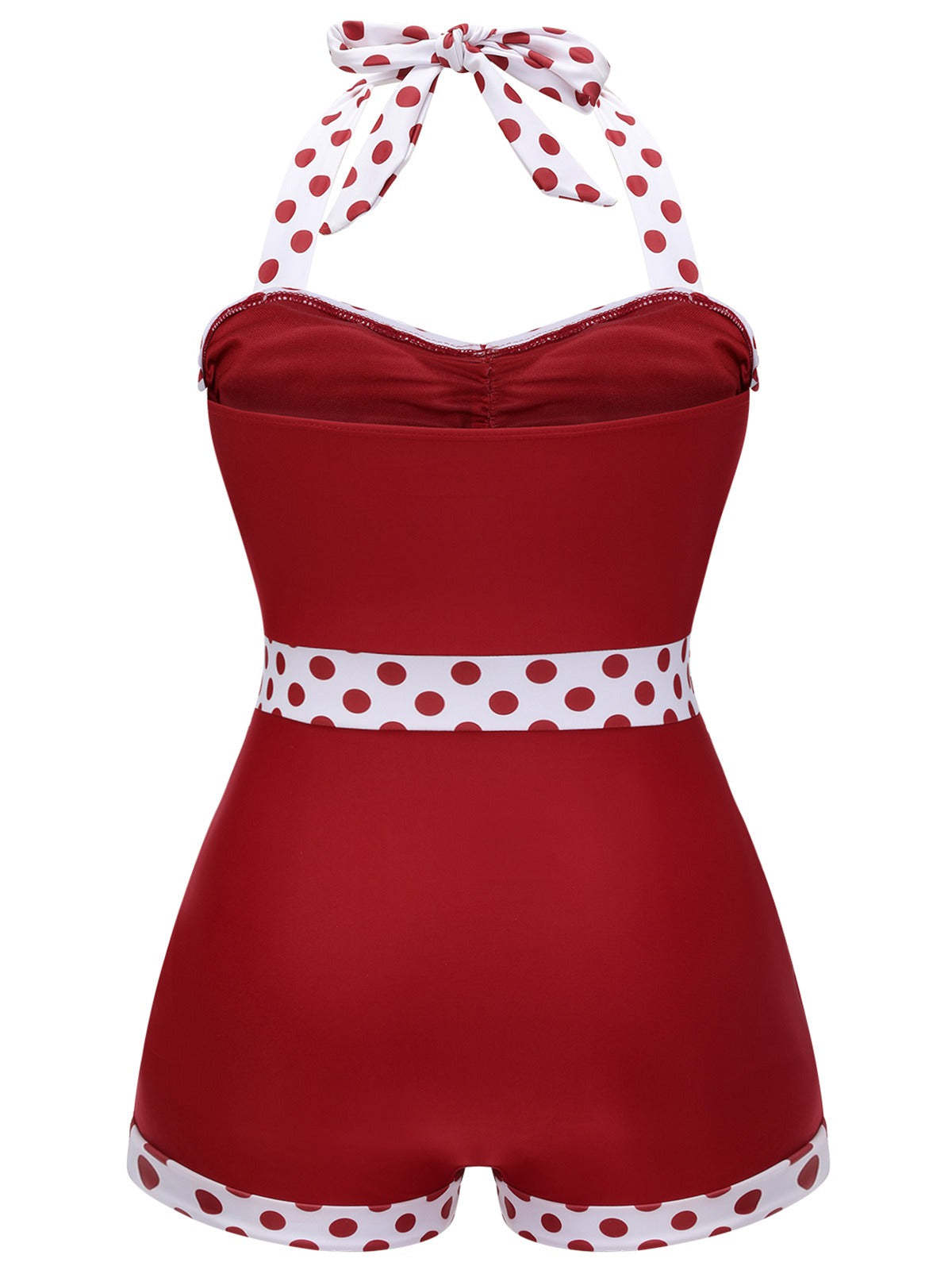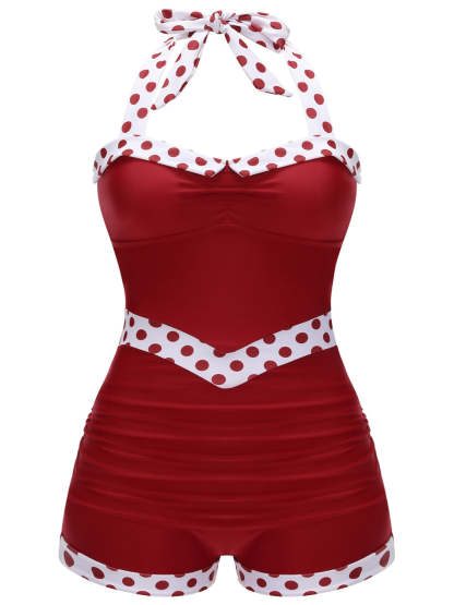 [Plus Size] Red 1940s Dots Patchwork Halter Swimsuit