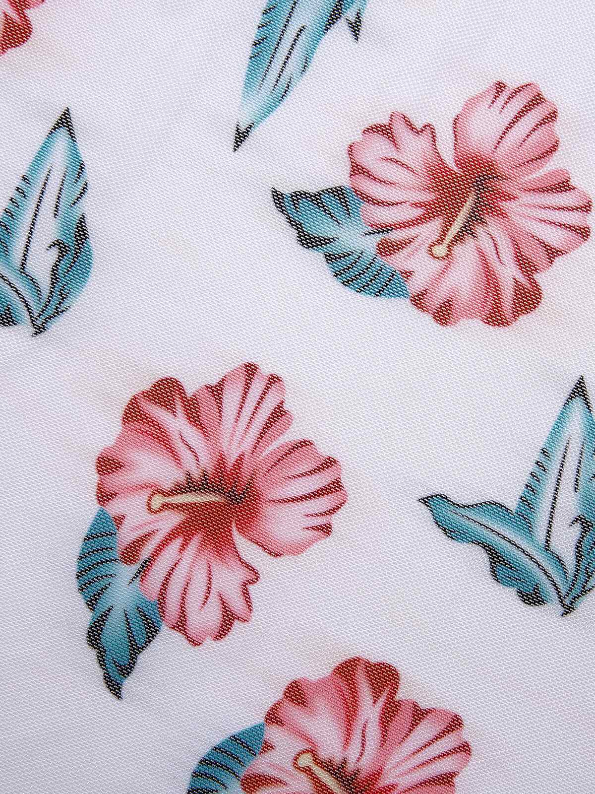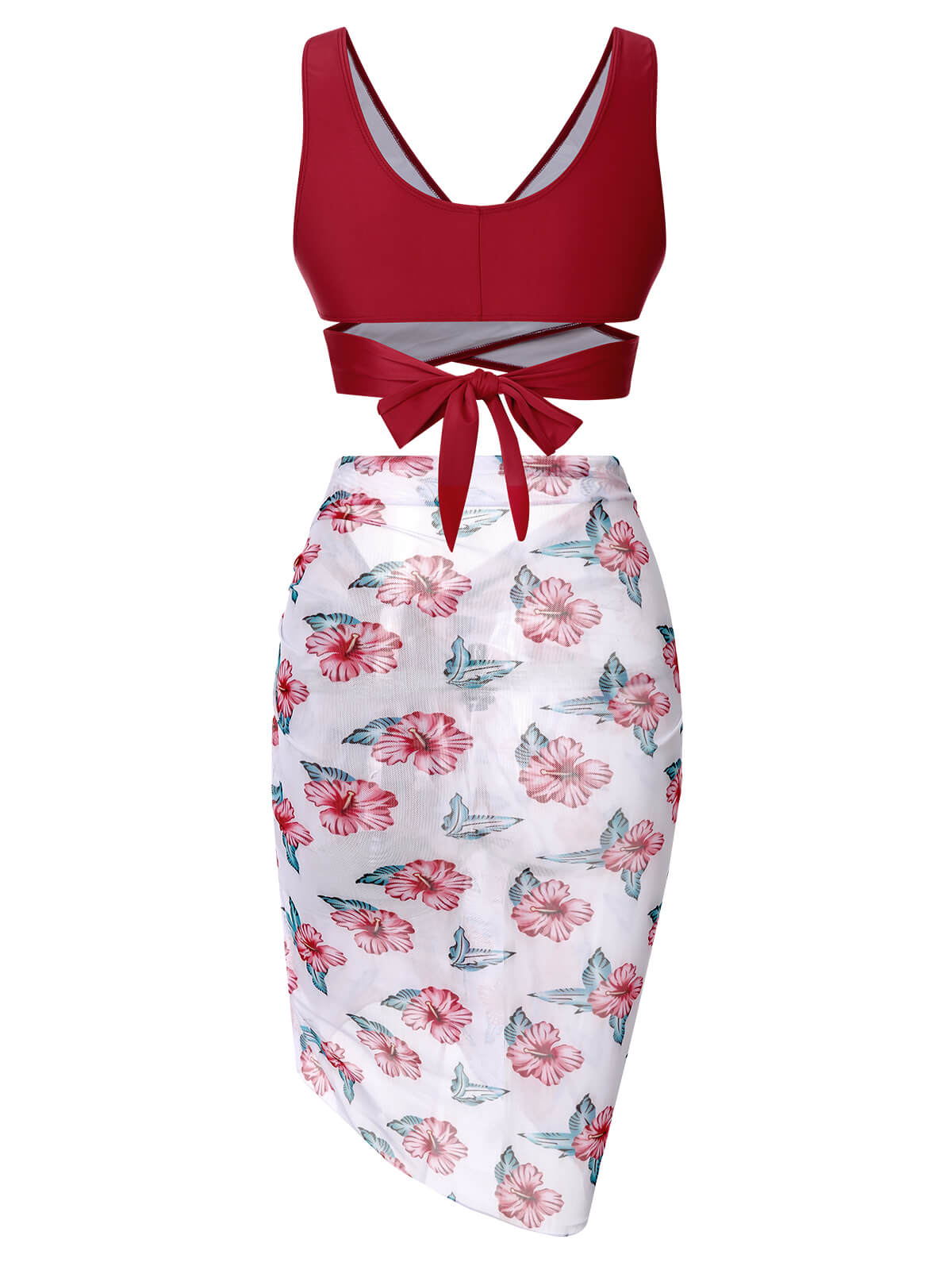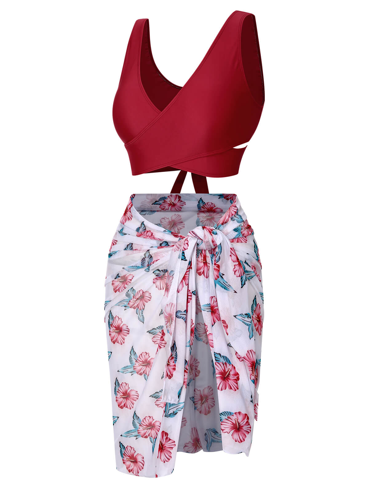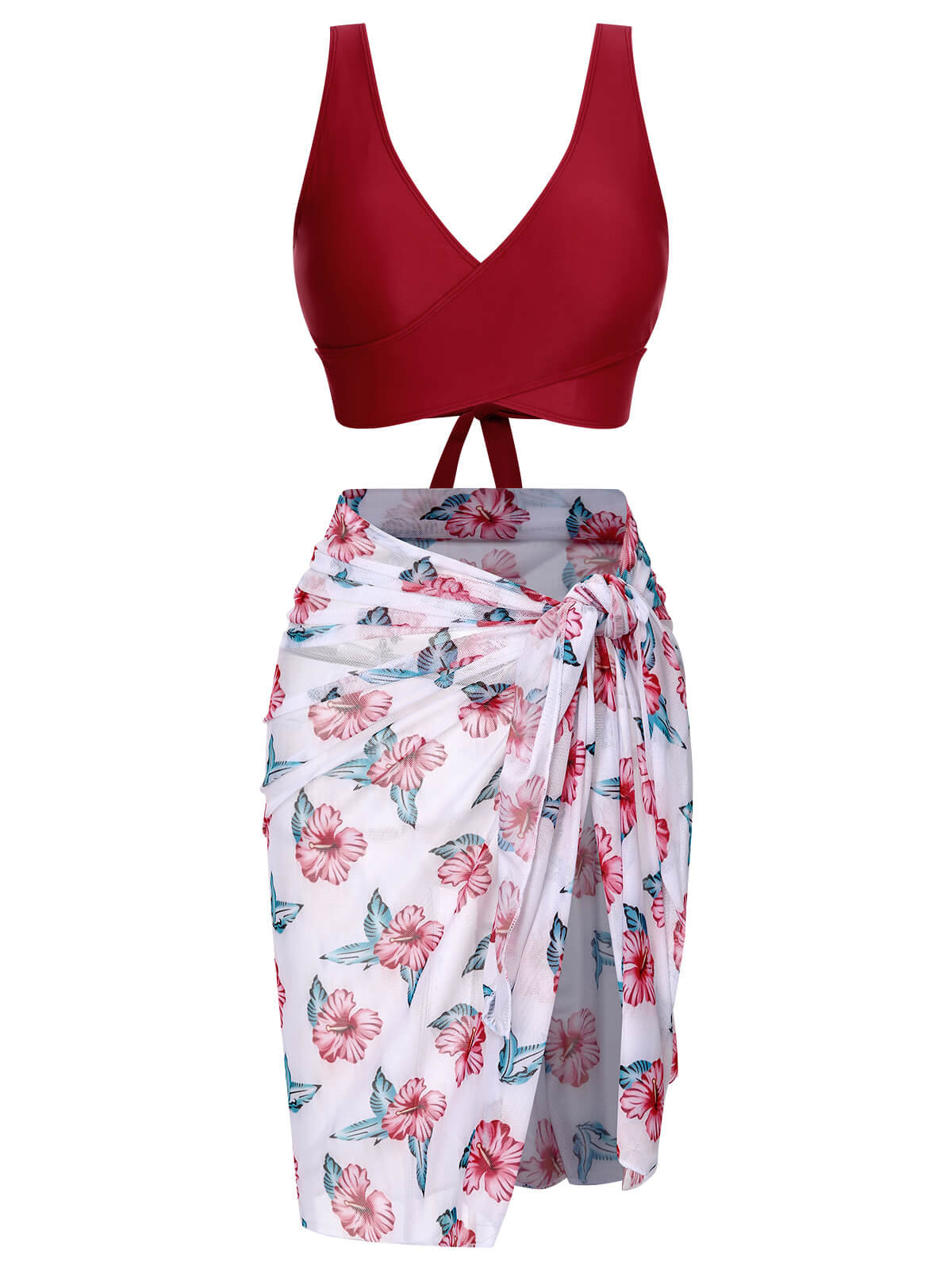 [Plus Size] Wine Red 1930s Floral Bikini Set & Cover-Up