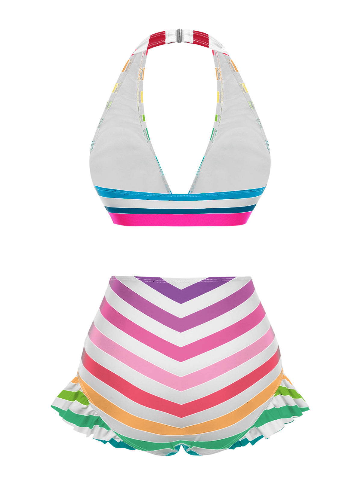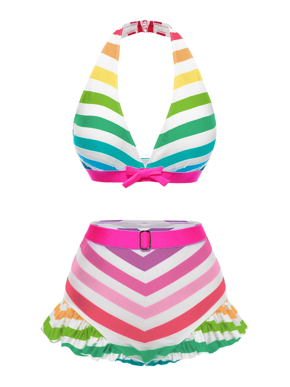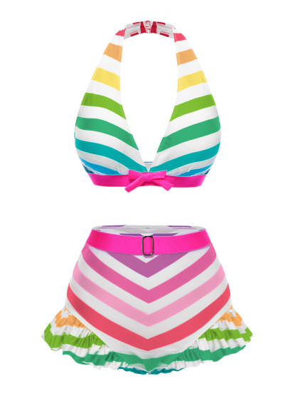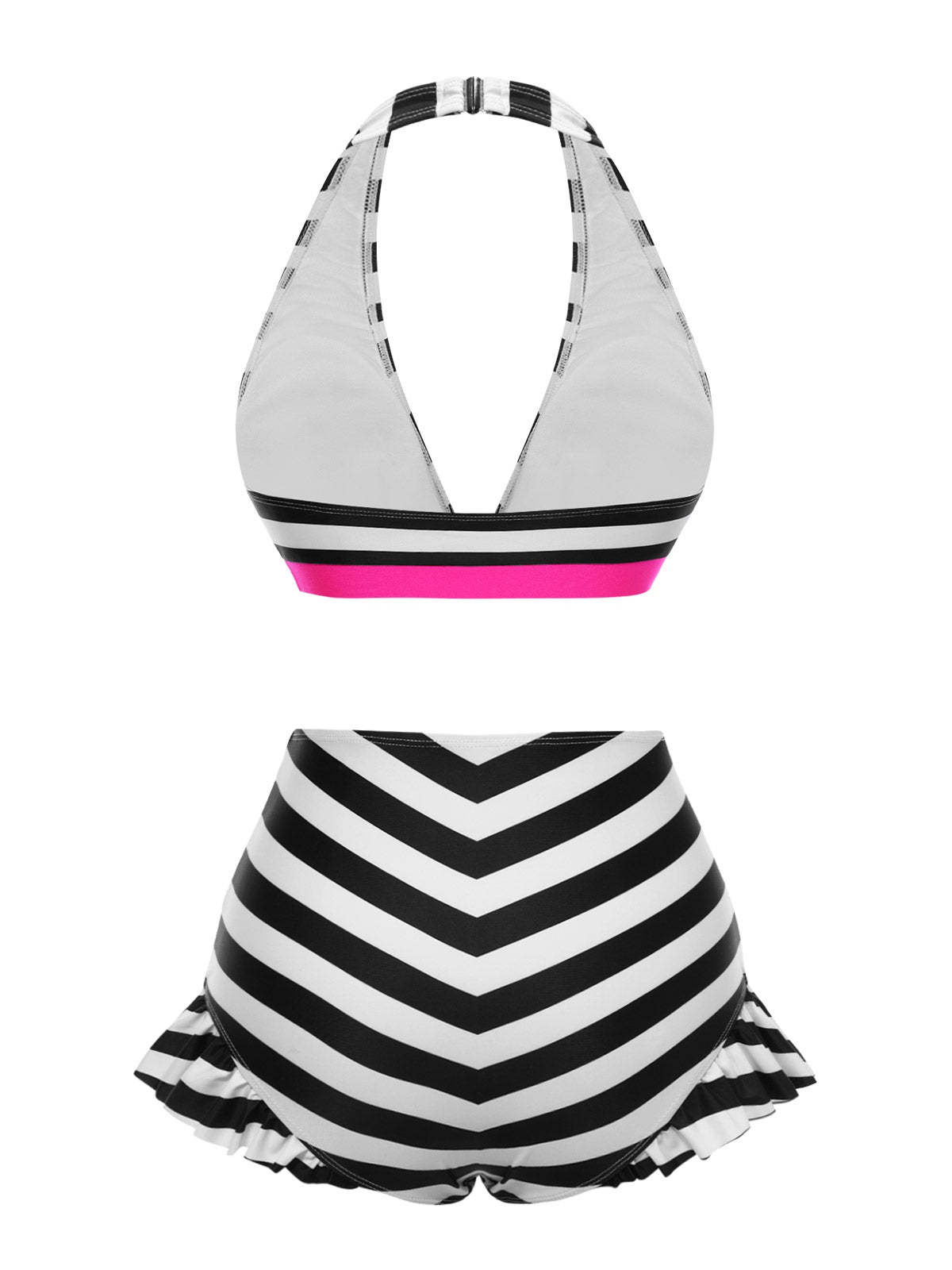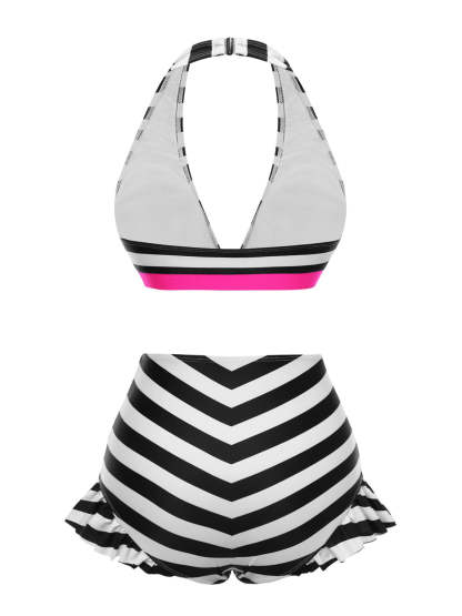 [US Warehouse] Black 1950s Contrast Bow Ruffle Stripes Bikini