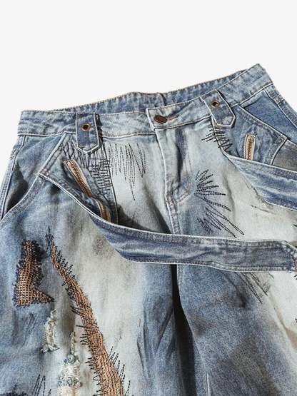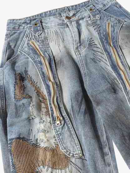 • Design Elements: Artistic embroidery patterns, front zipper closure, side zippers