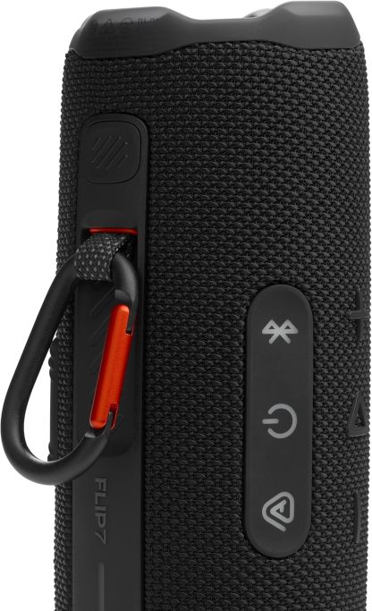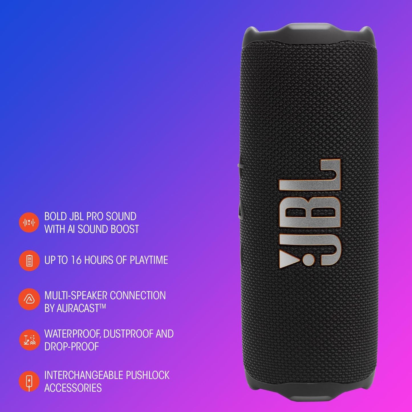 Flip 7 - Portable Waterproof and Drop-Proof Speaker, Bold Pro Sound with AI Sound Boost, 16Hrs of Playtime, and PushLock System with Interchangeable Accessories (Black)