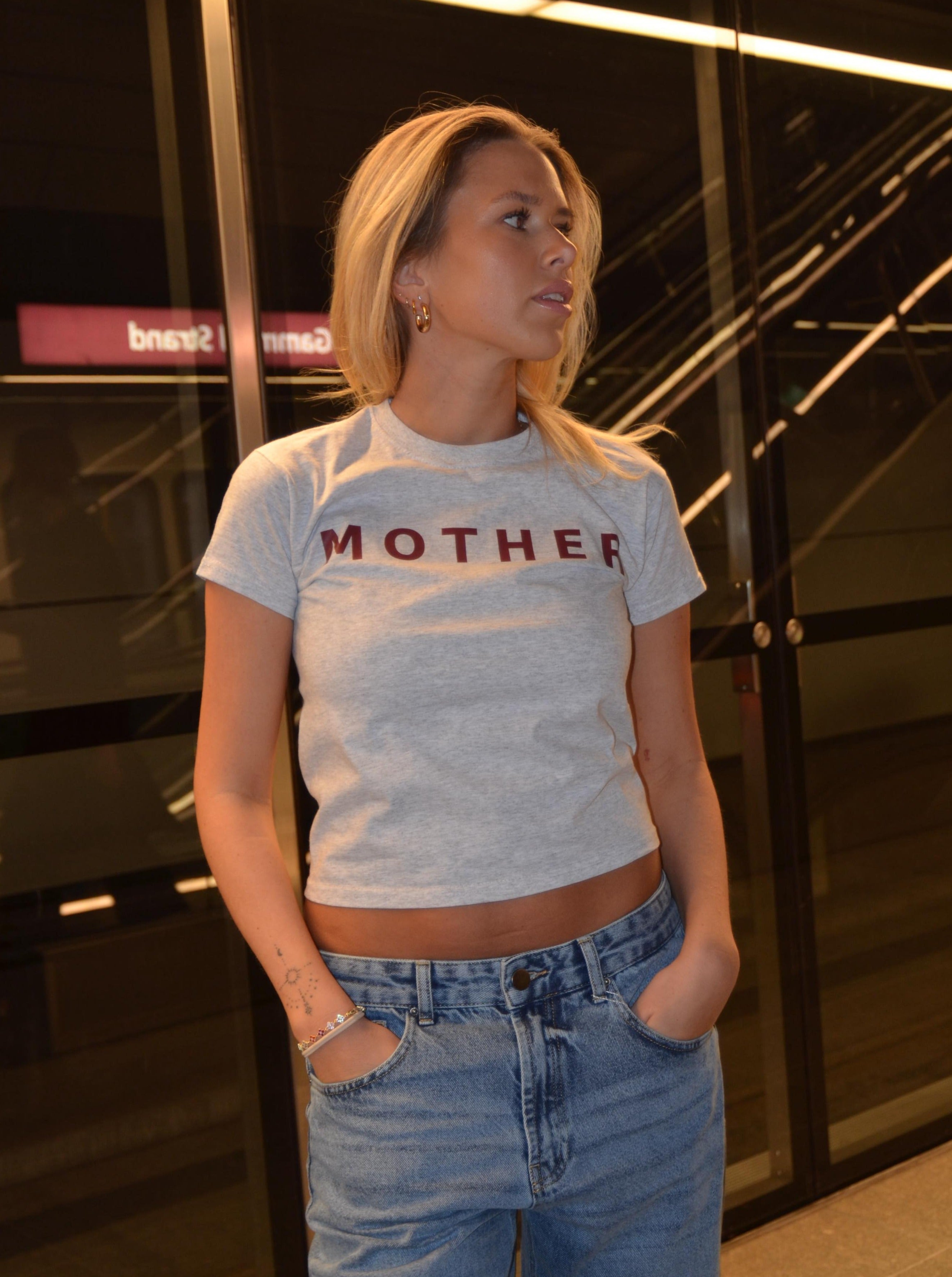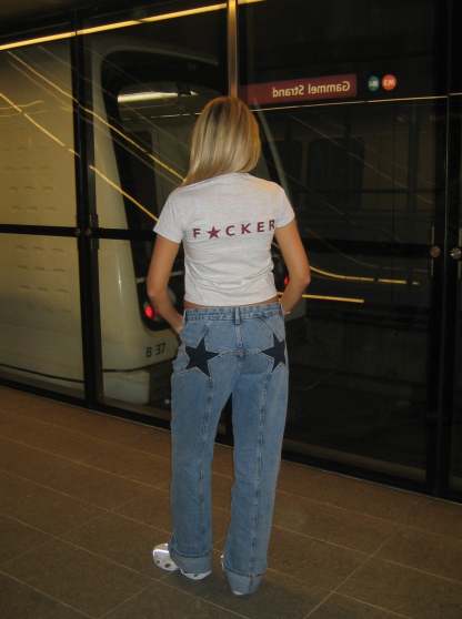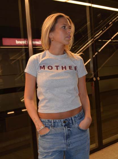 Baby tee with the text "mother" on the front and "f*cker" on the back, with a star between the f and the c. Our tees are from fruit of the loom and in a super soft and comfortable quality.