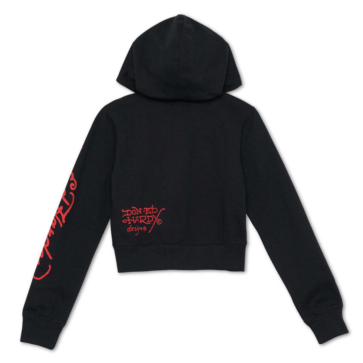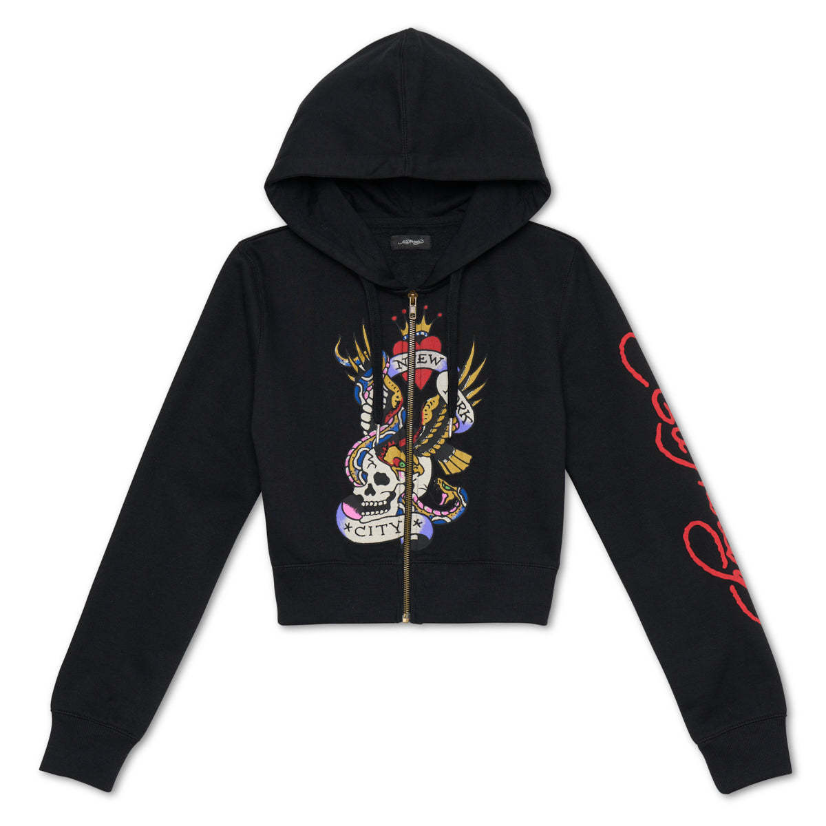 This Ed Hardy hoodie features NYC Skull graphics. Cropped above the waist and fitted with a zipper at the front. Finished with a cozy hood.