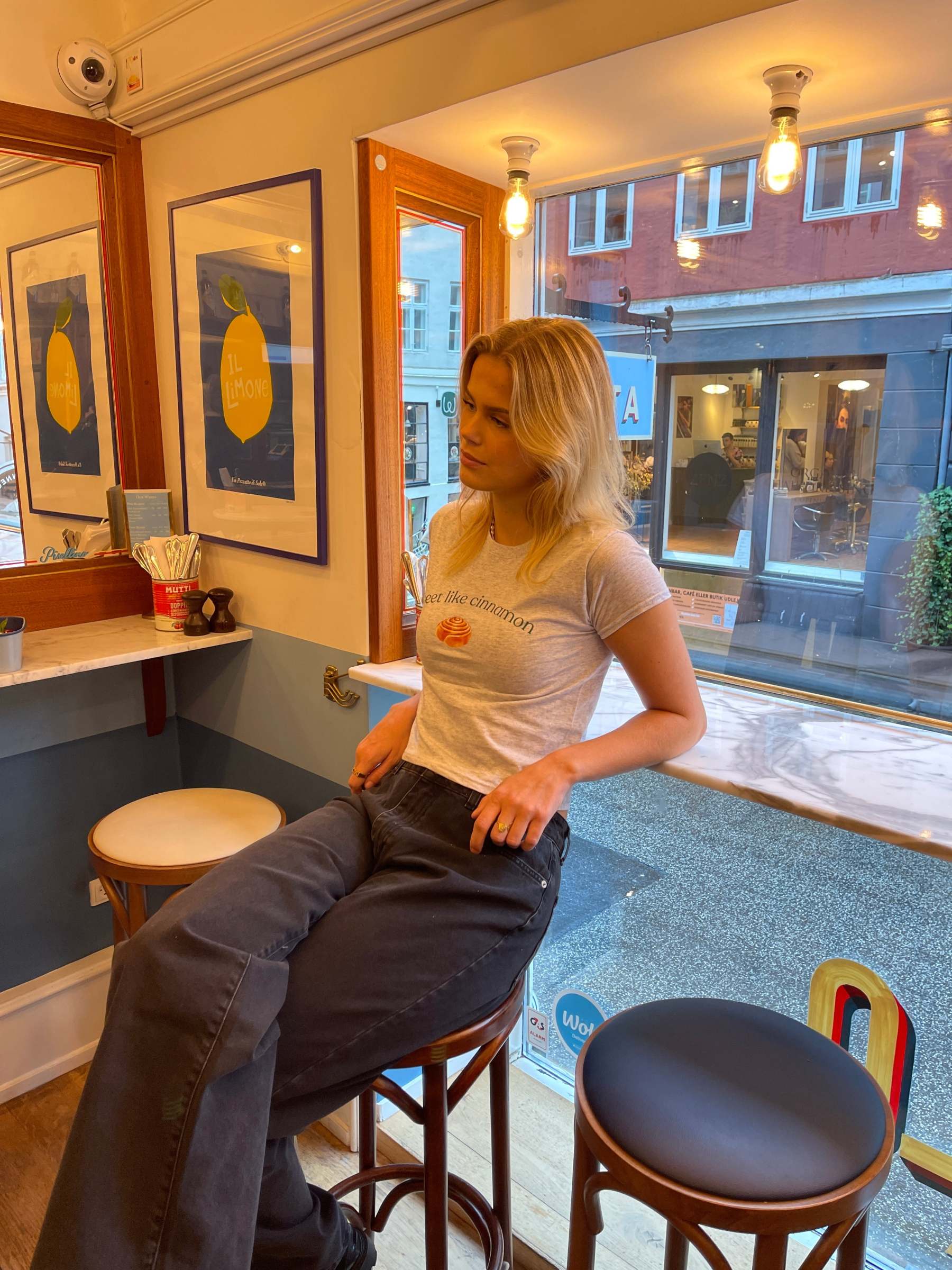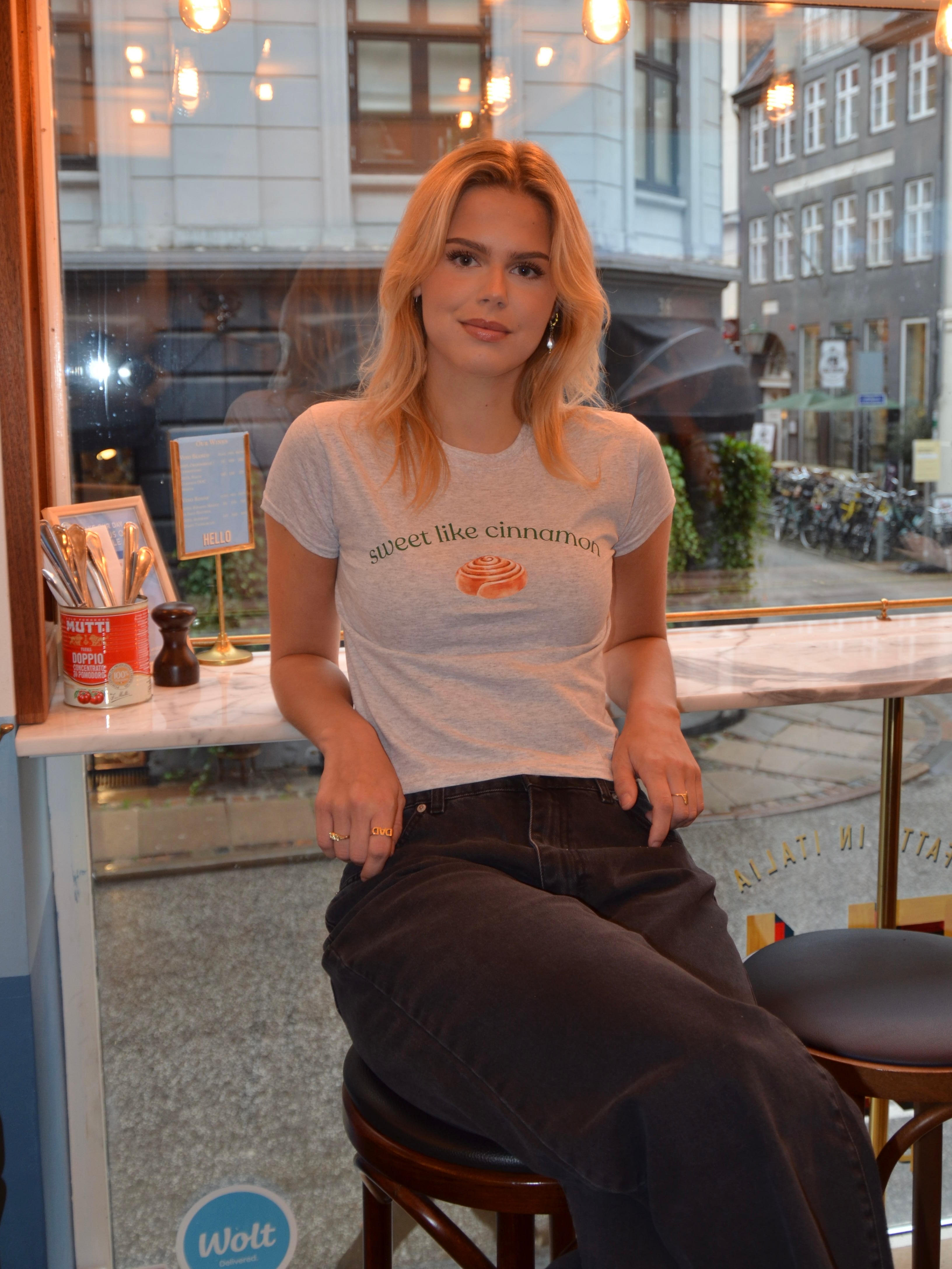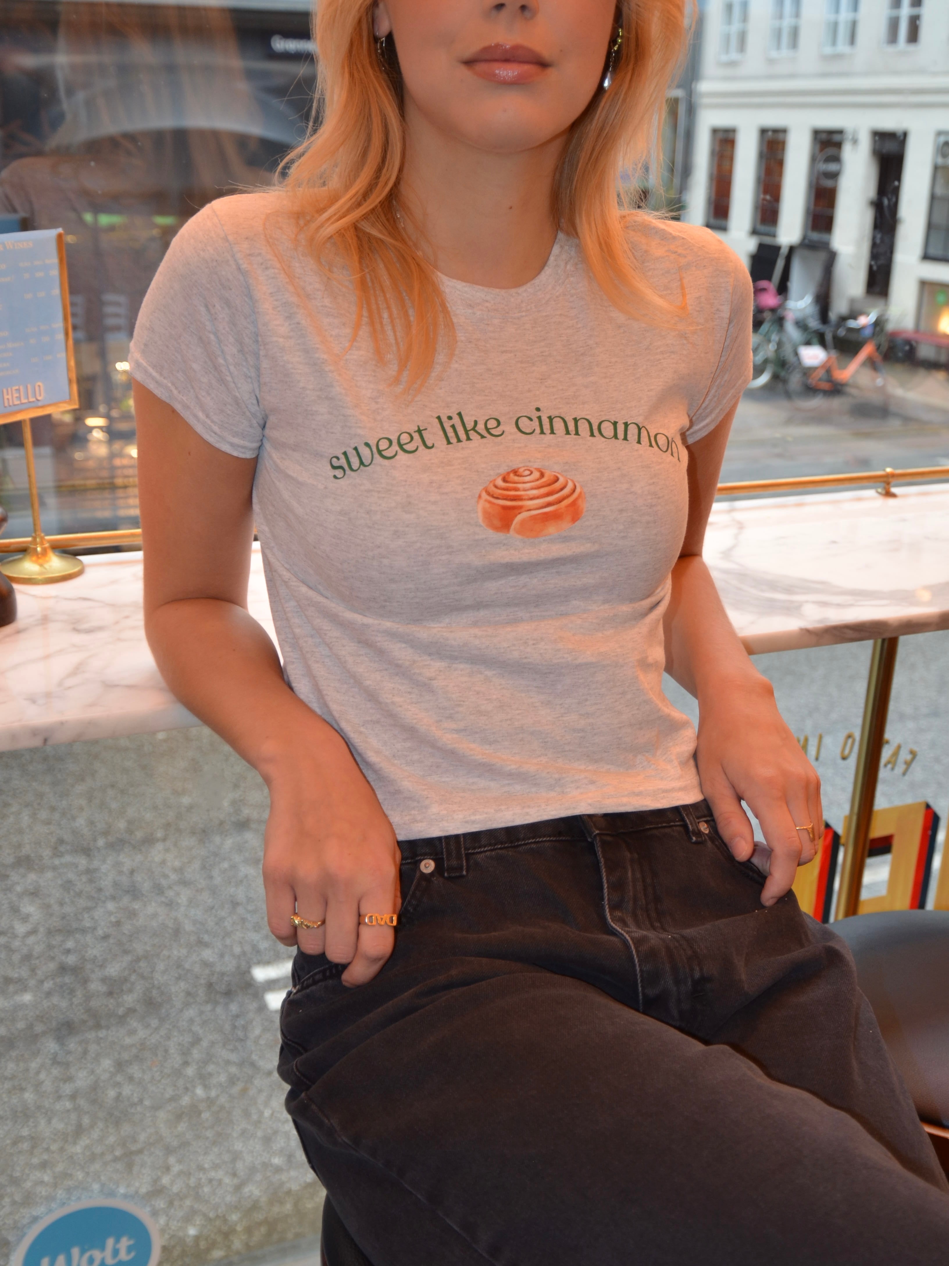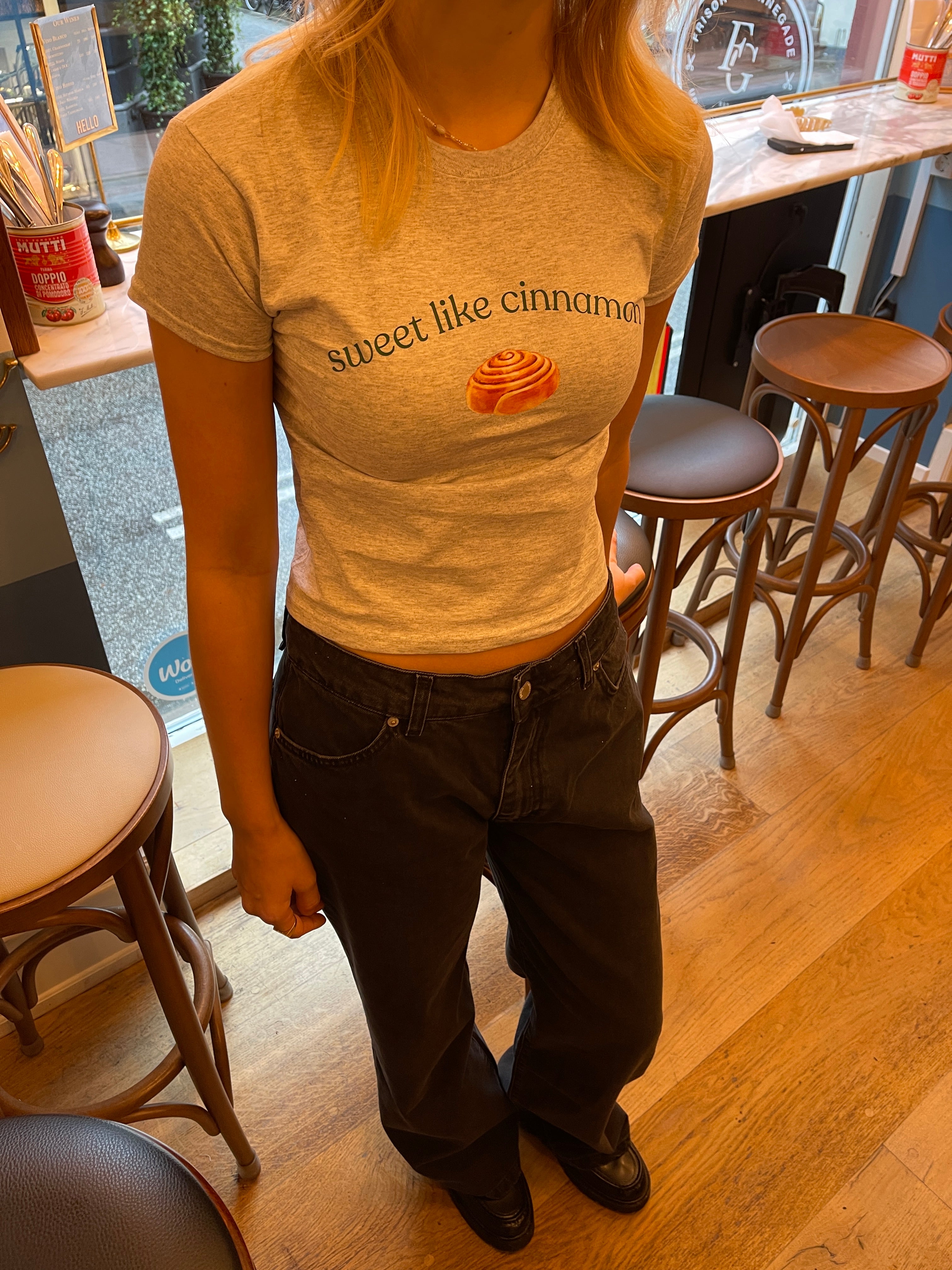 Baby tee with the text "sweet like cinnamon" and a cinnamon roll on it. Our tees are from Fruit of the Loom and made from super soft and comfortable quality.
