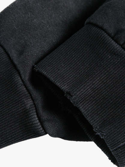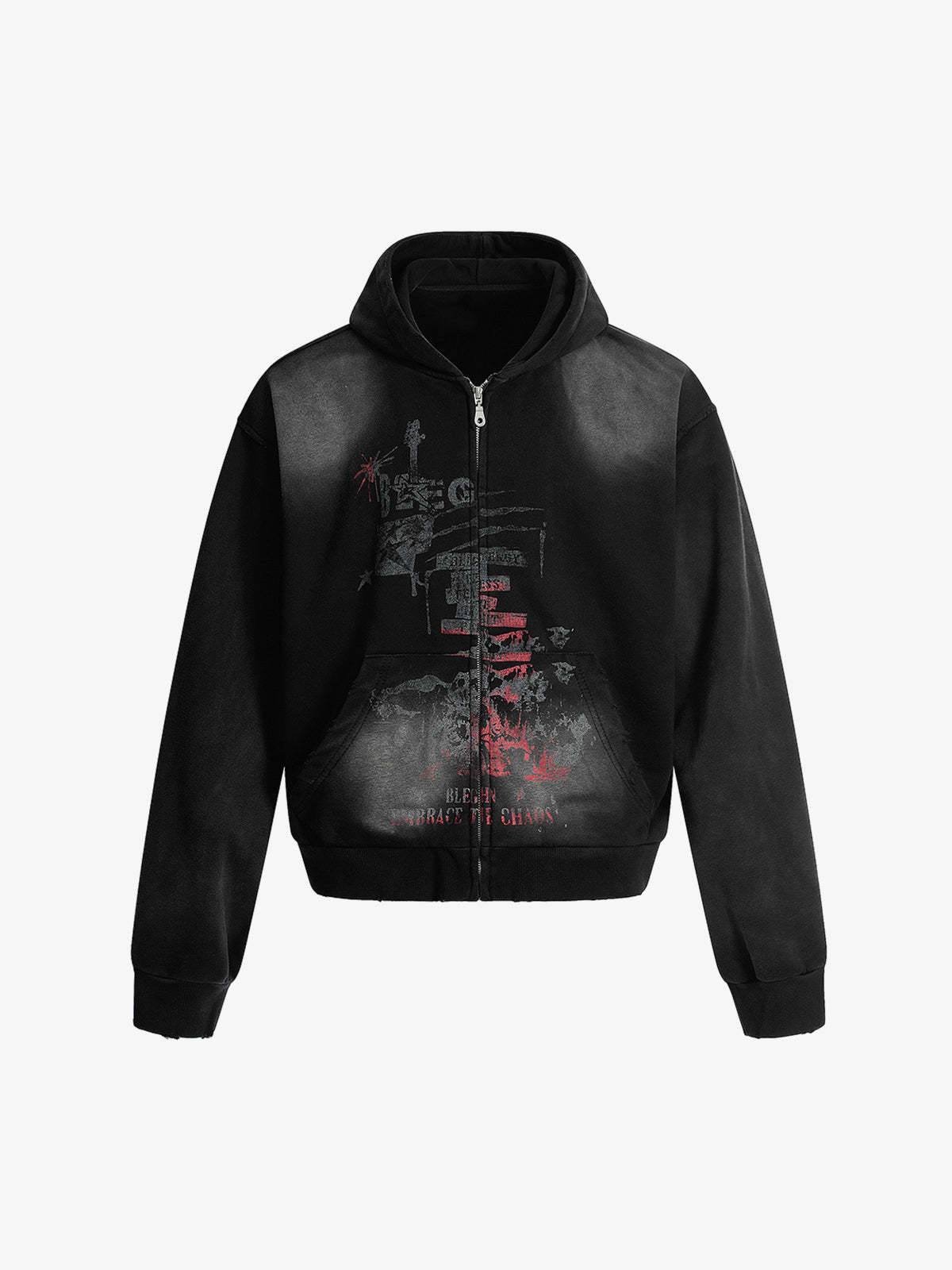 • Design Elements: Distressed graphic print, bold text design, hooded silhouette