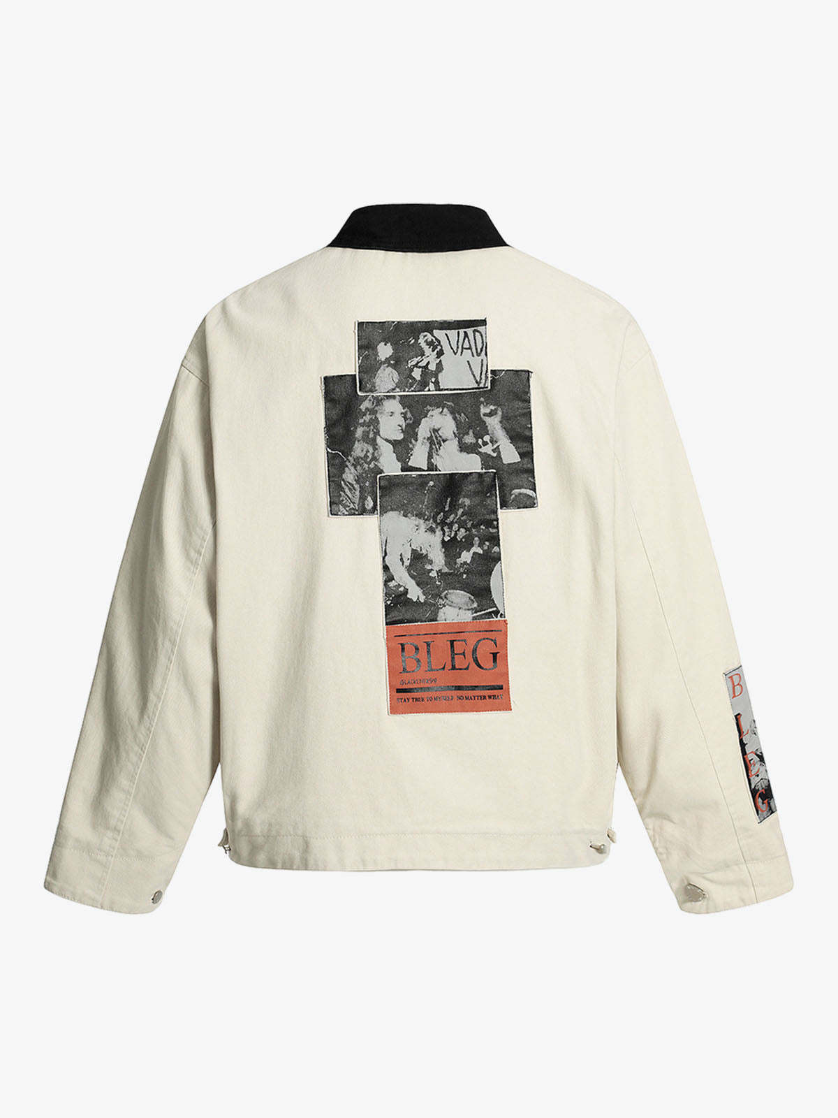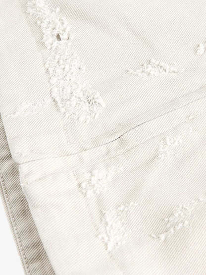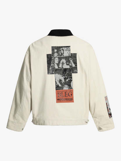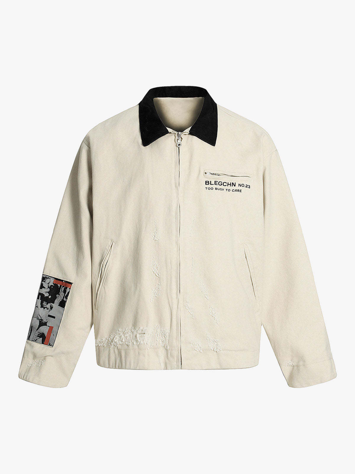• Design Elements: Distressed details, bold lettering on the chest pocket, graphic patch on the sleeve